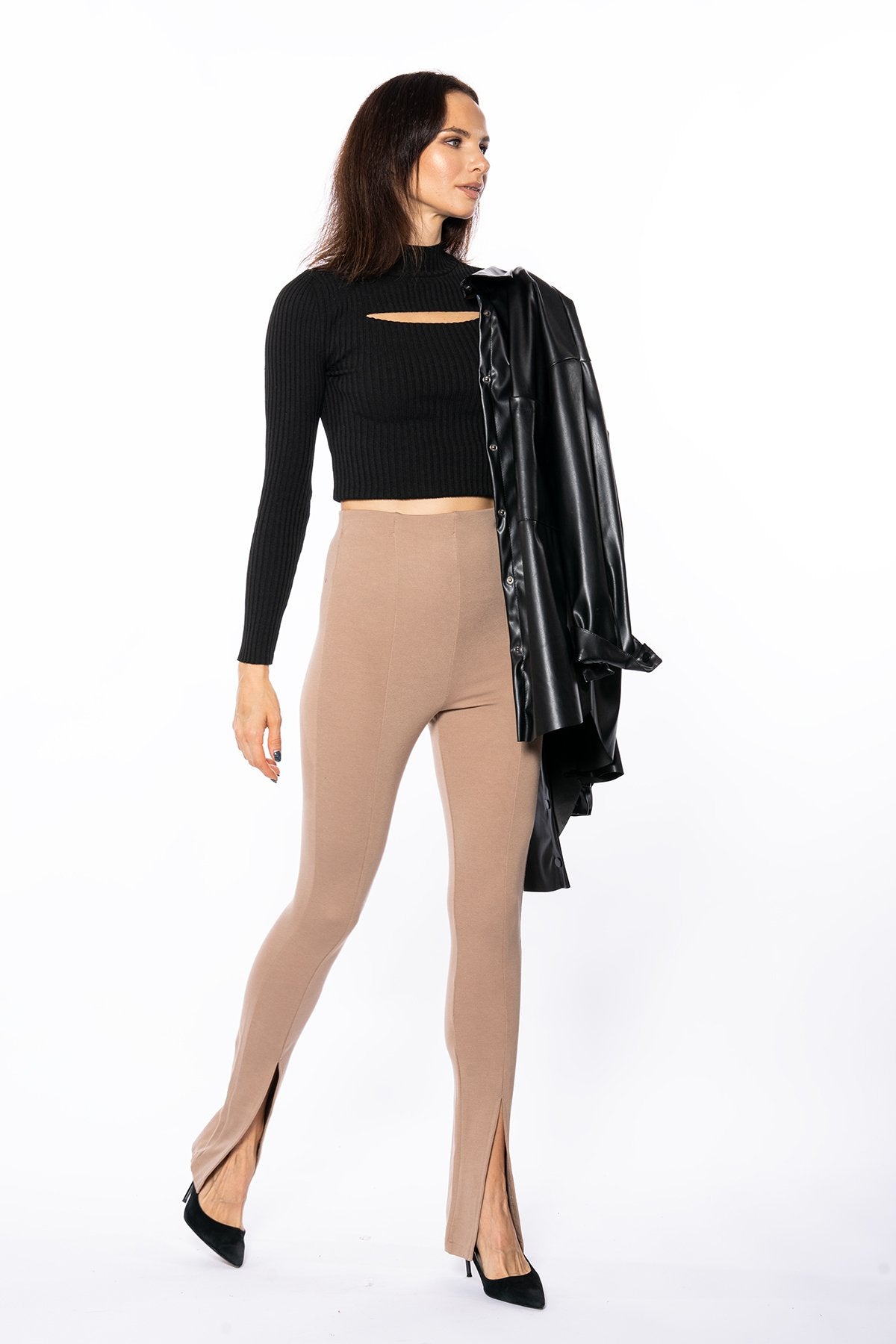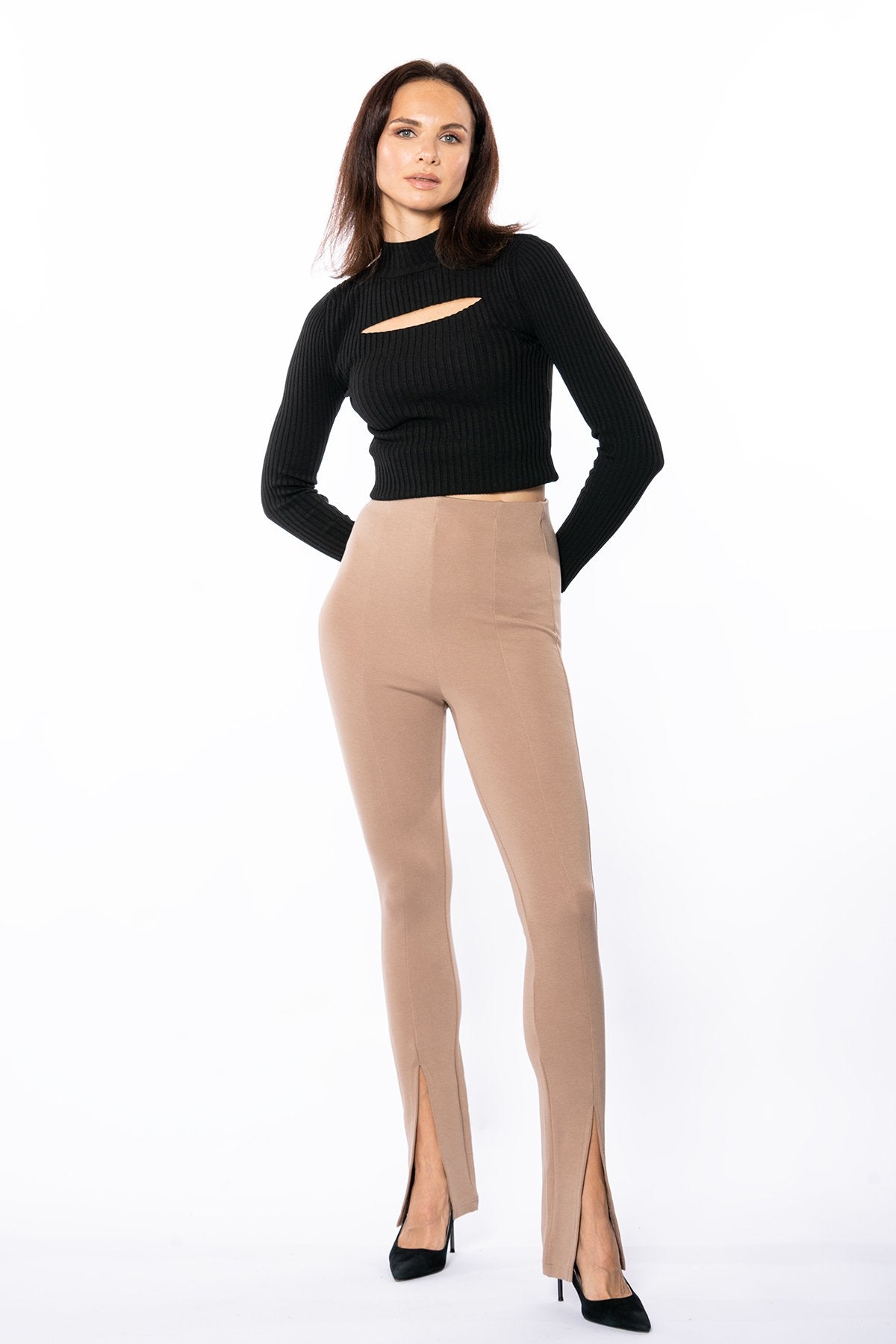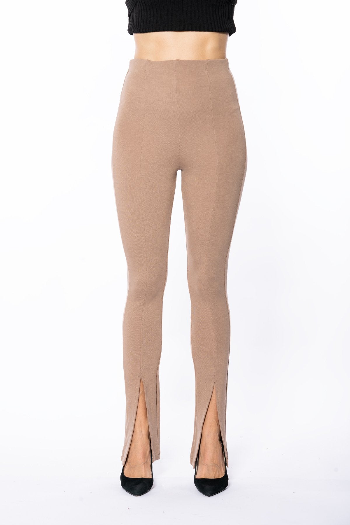 Bej Yüksek Bel Önü Yırtmaçlı Bol Paça Toparlayıcı Tayt