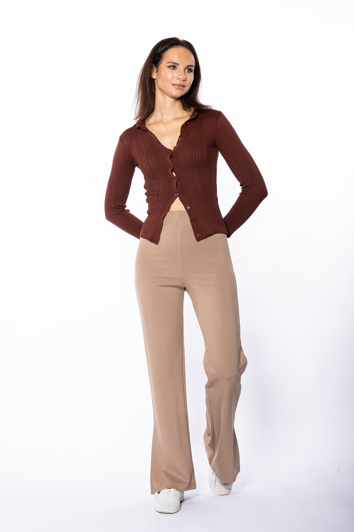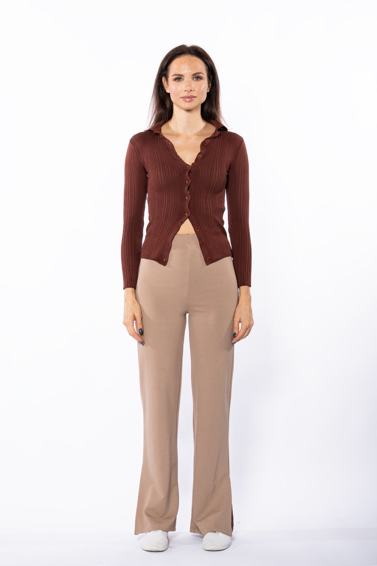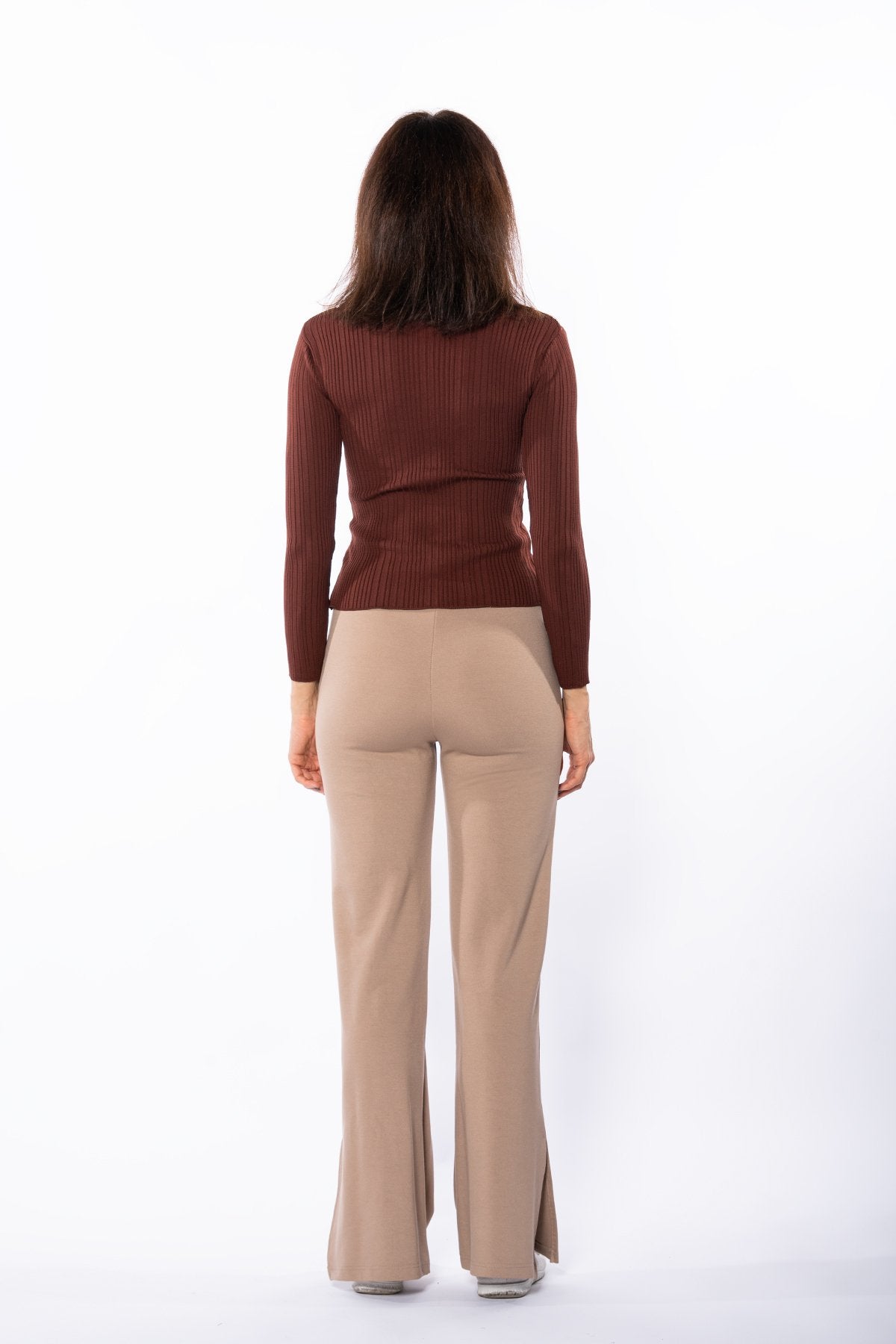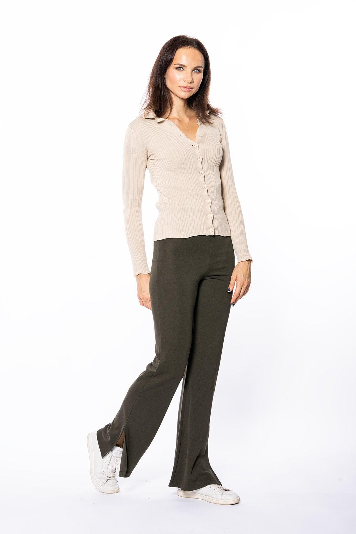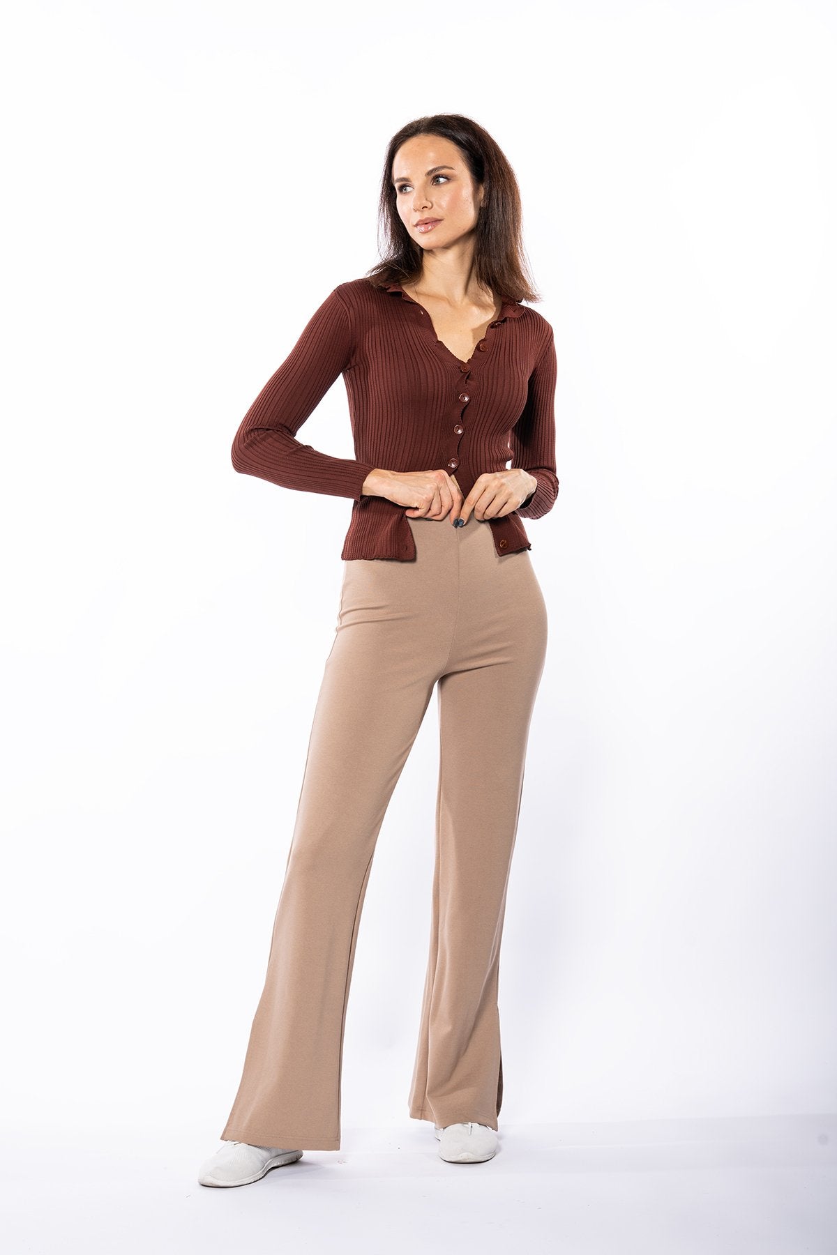 Bej Yüksek Bel Yan Yırtmaçlı Ispanyol Paça Toparlayıcı Tayt