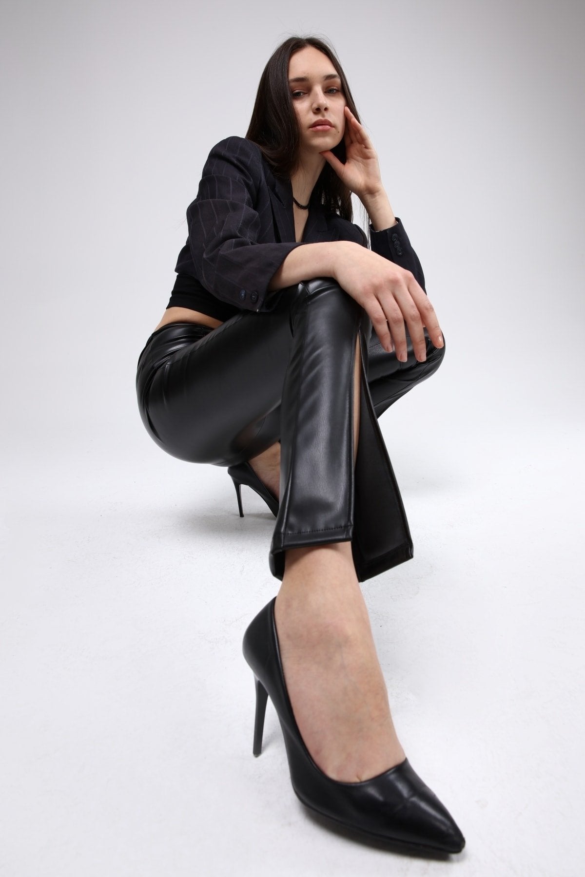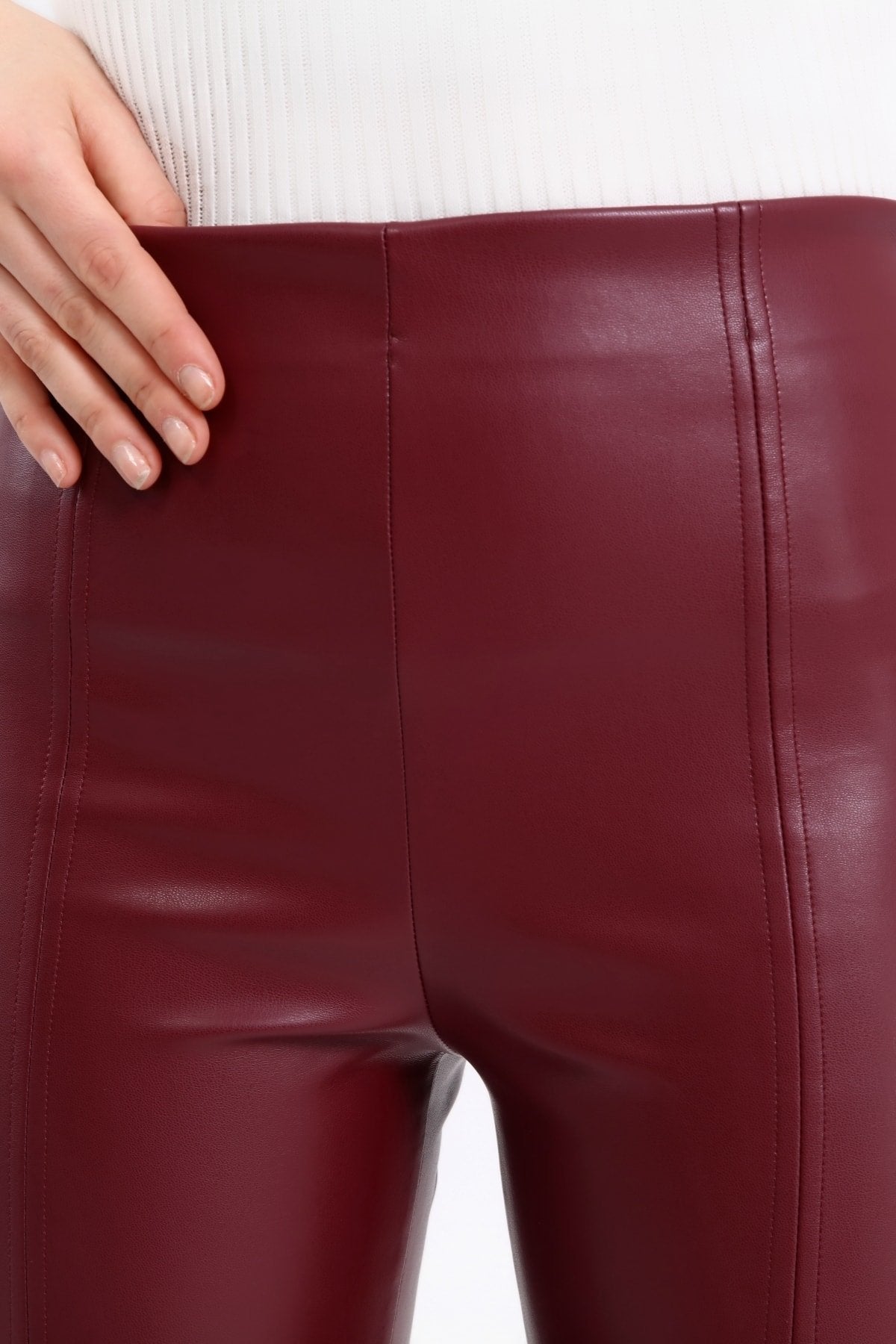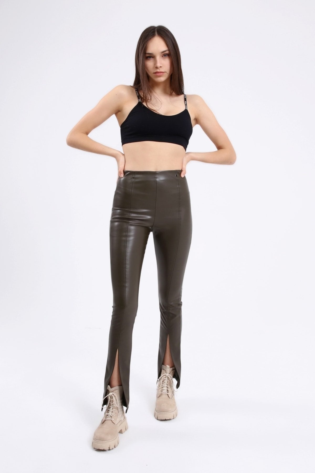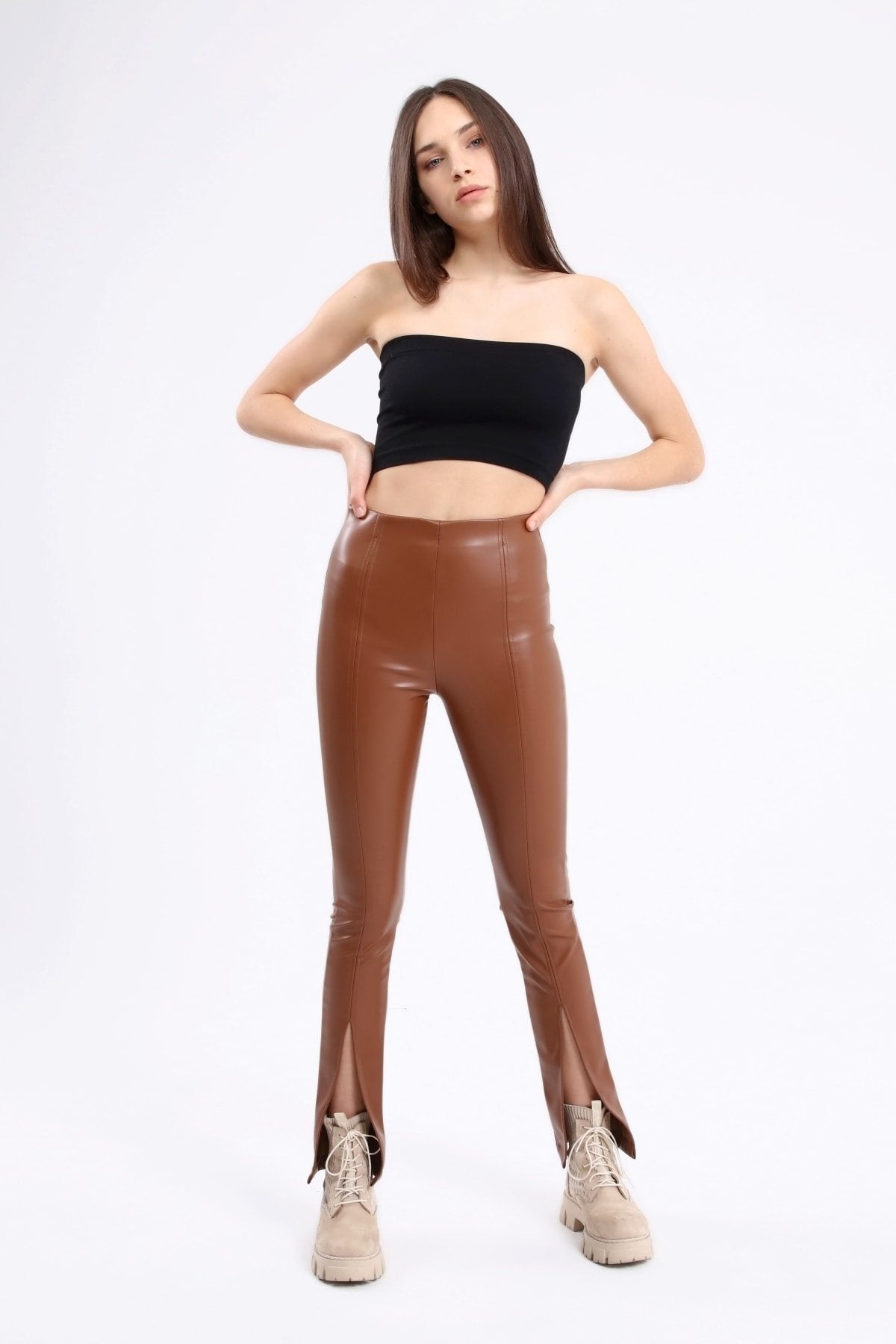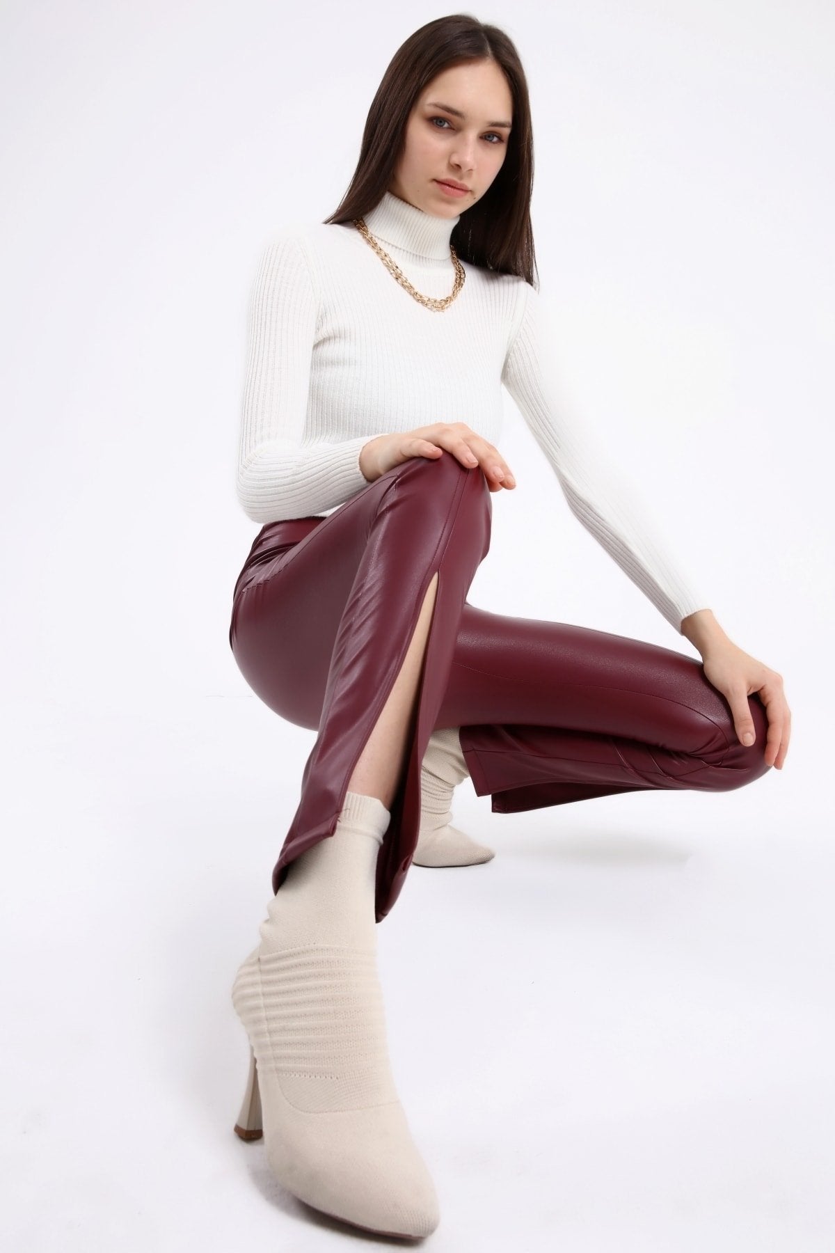 Önü Yırtmaçlı Çıma Dikişli Kalın Şardonlu Yüksek Bel Deri Pantolon Tayt