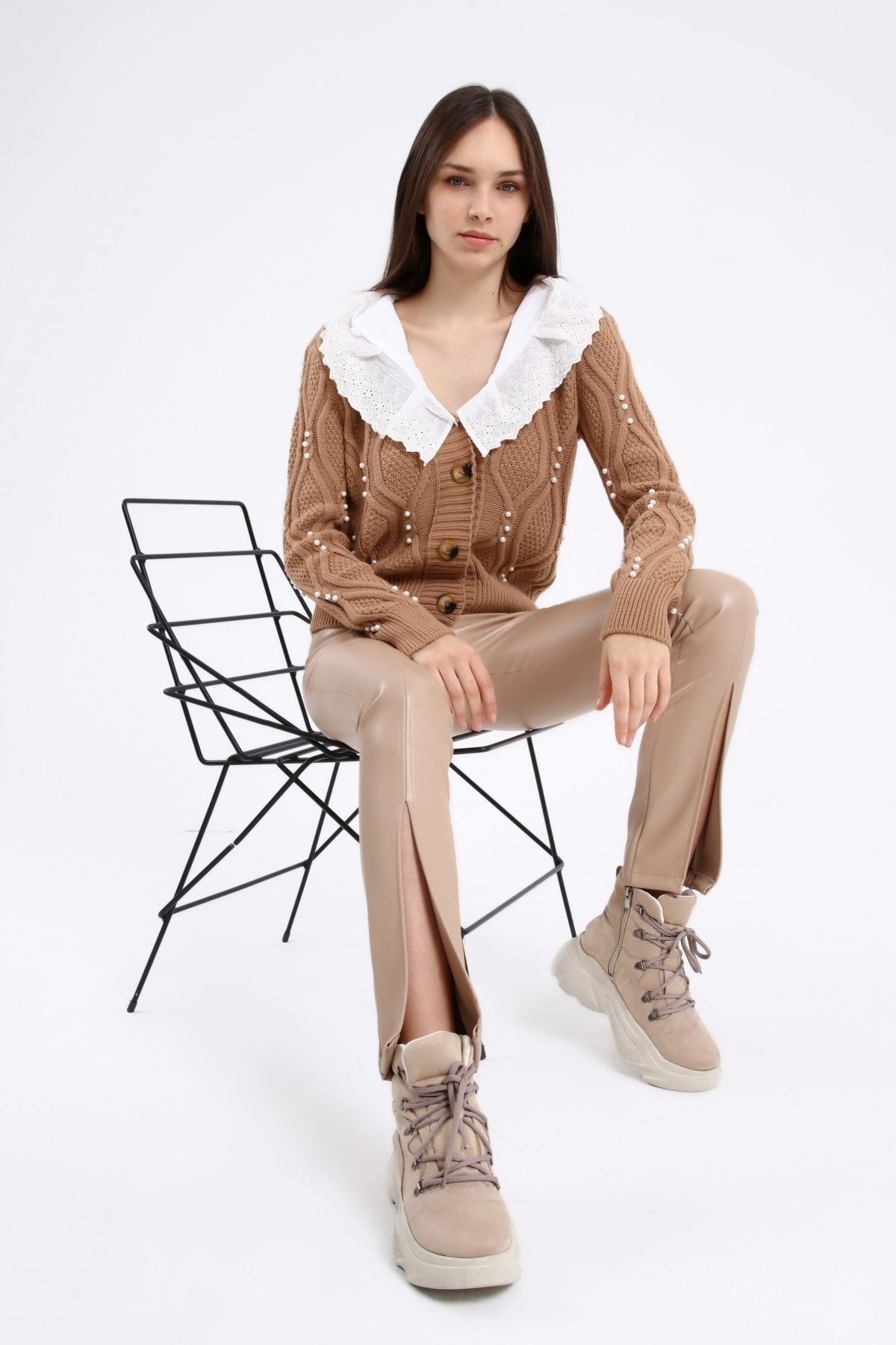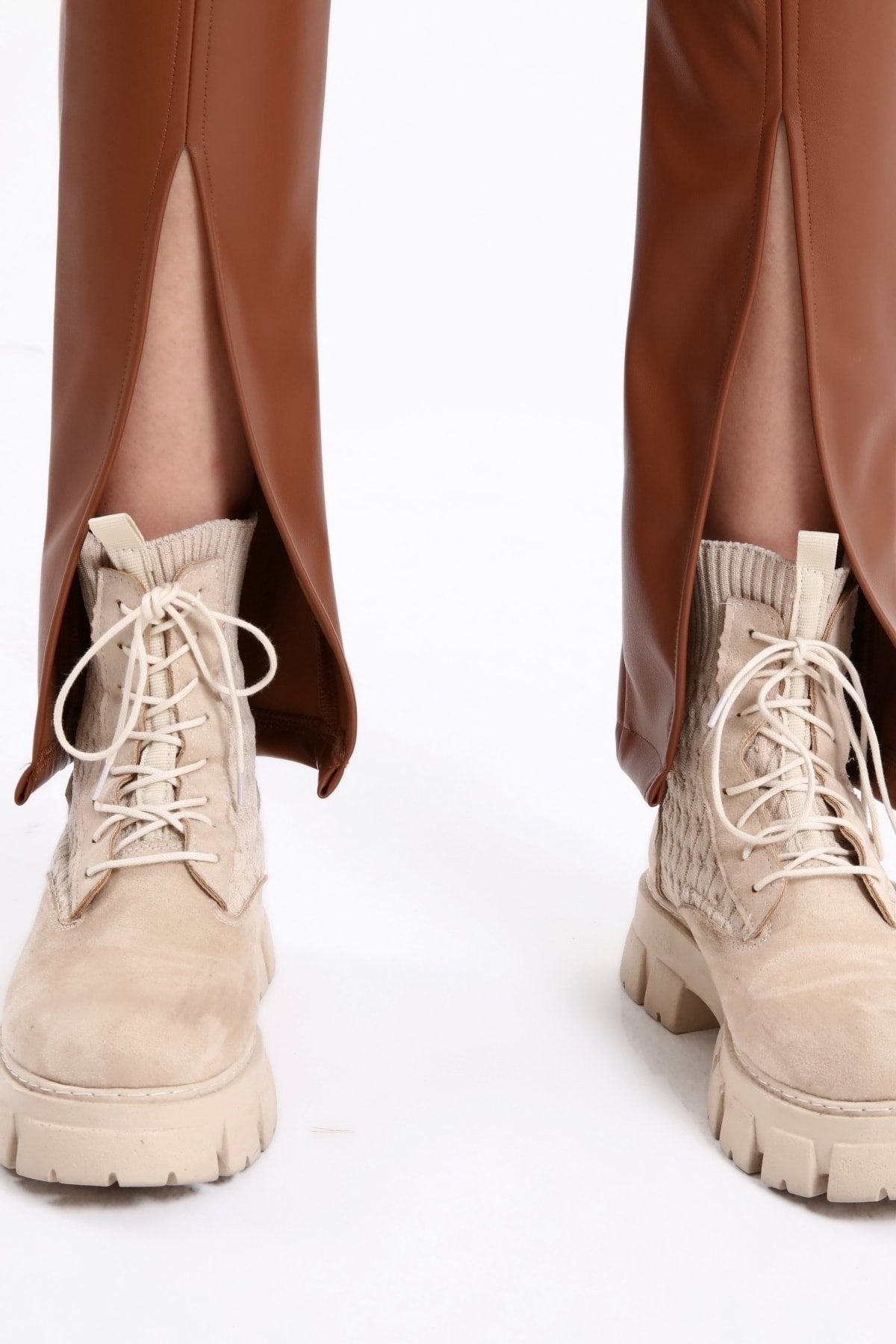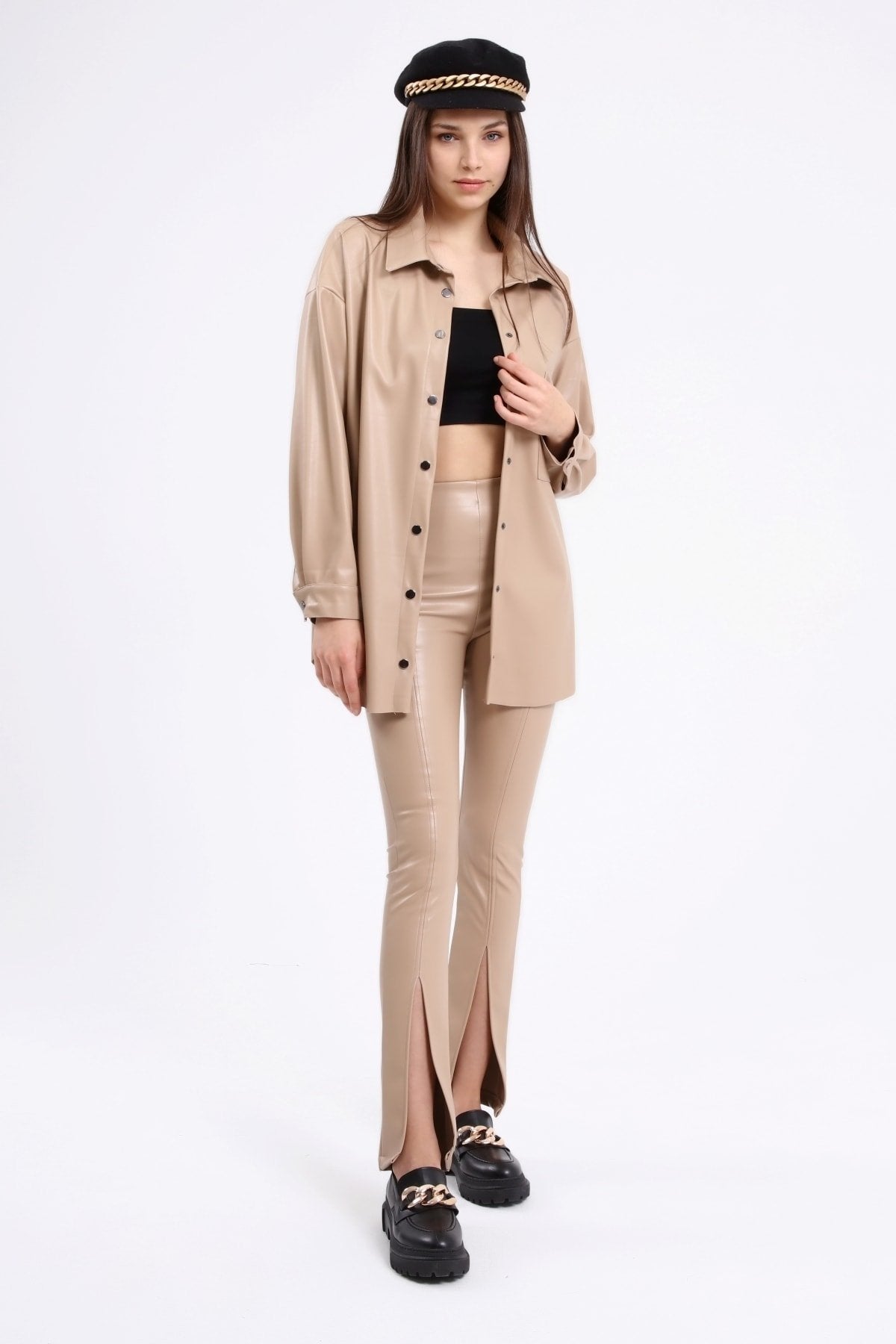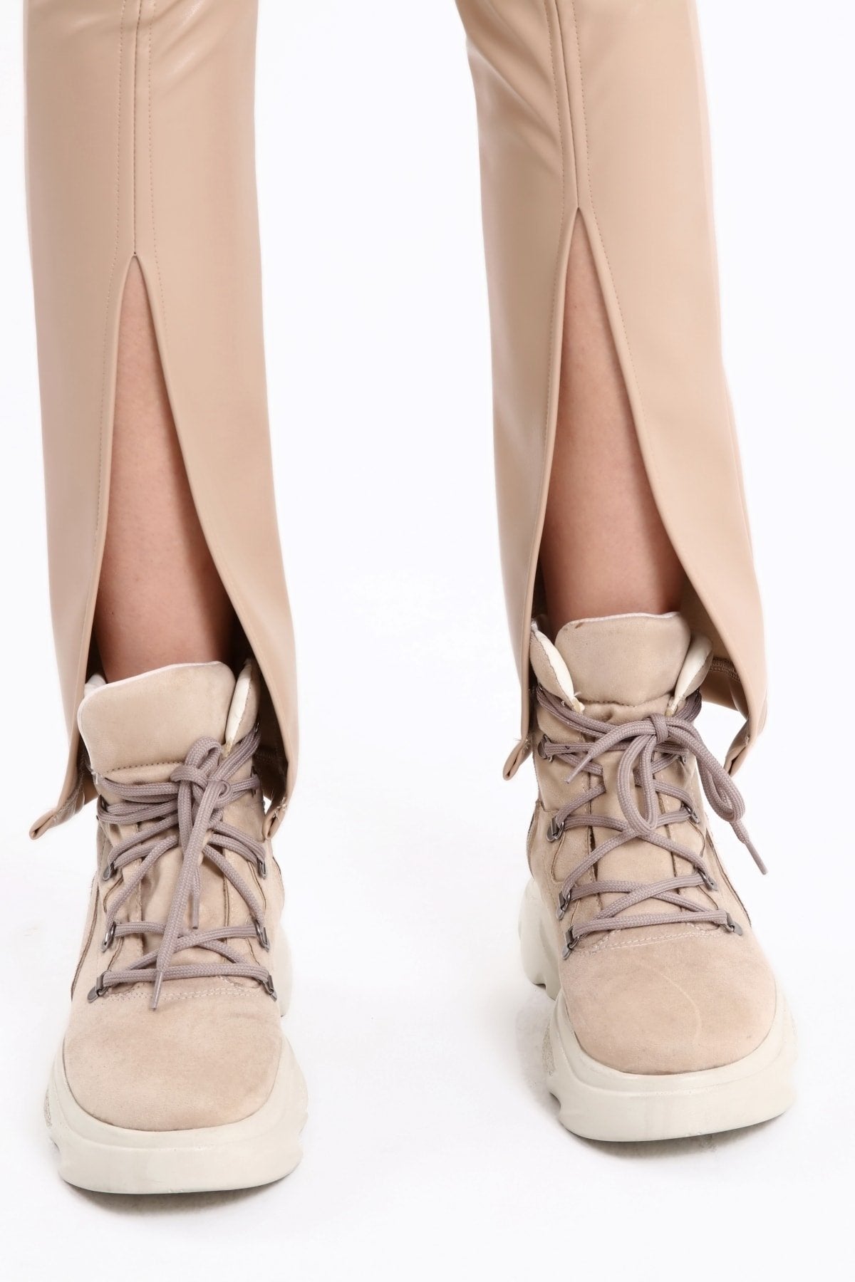 Önü Yırtmaçlı Çıma Dikişli Kalın Şardonlu Yüksek Bel Deri Pantolon Tayt