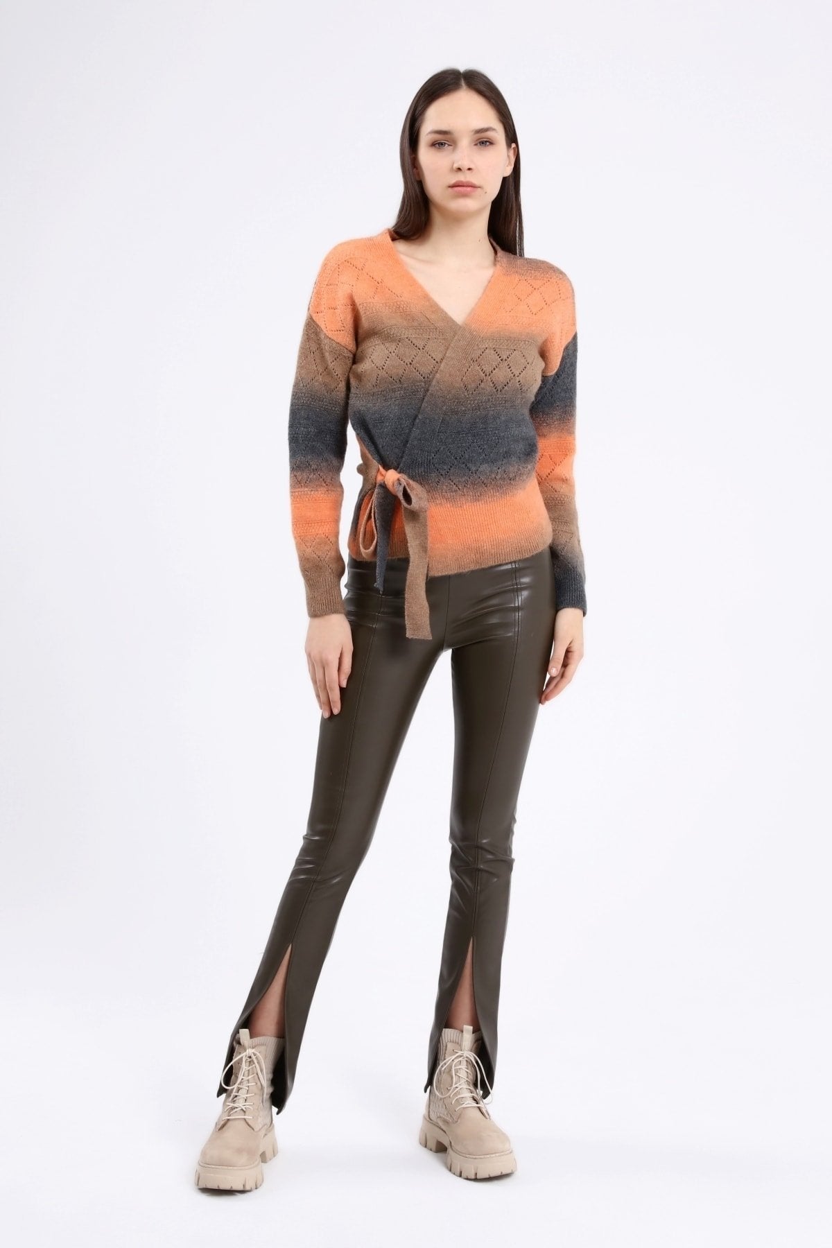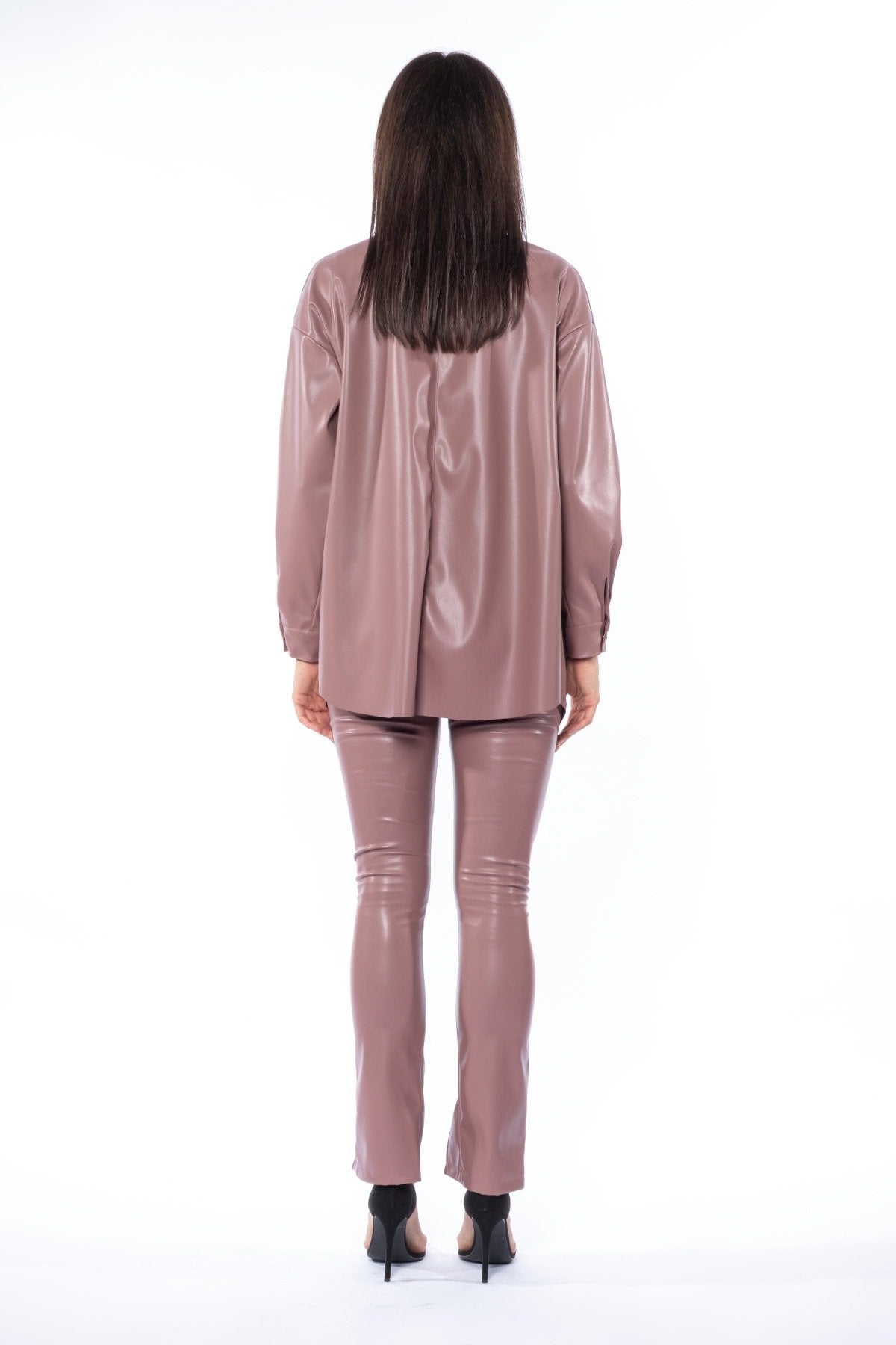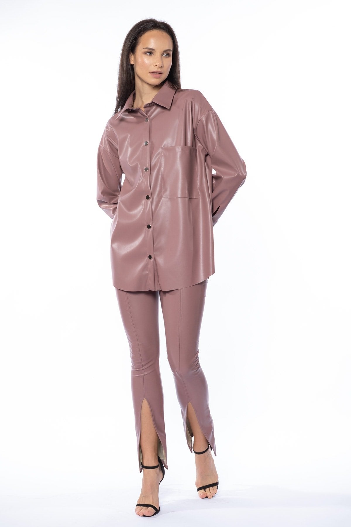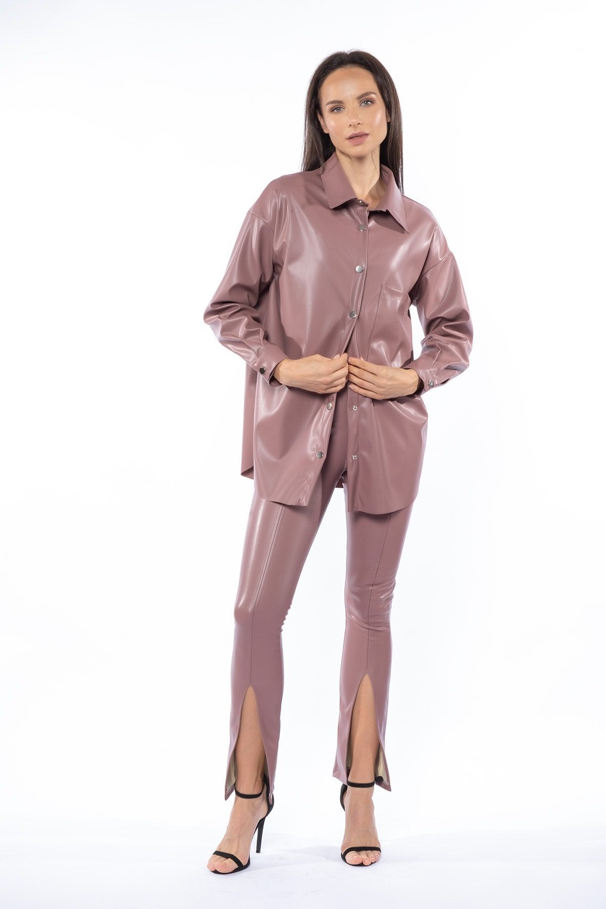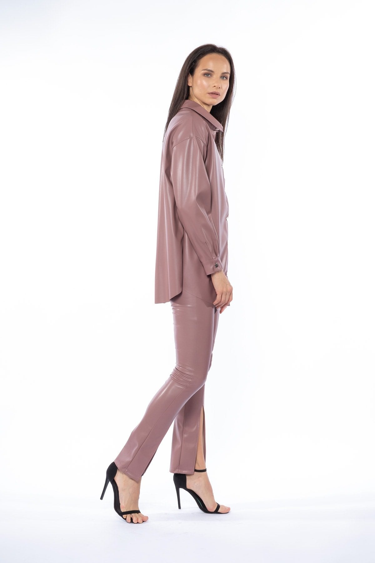 Önü Yırtmaçlı Çıma Dikişli Kalın Şardonlu Yüksek Bel Deri Pantolon Tayt
