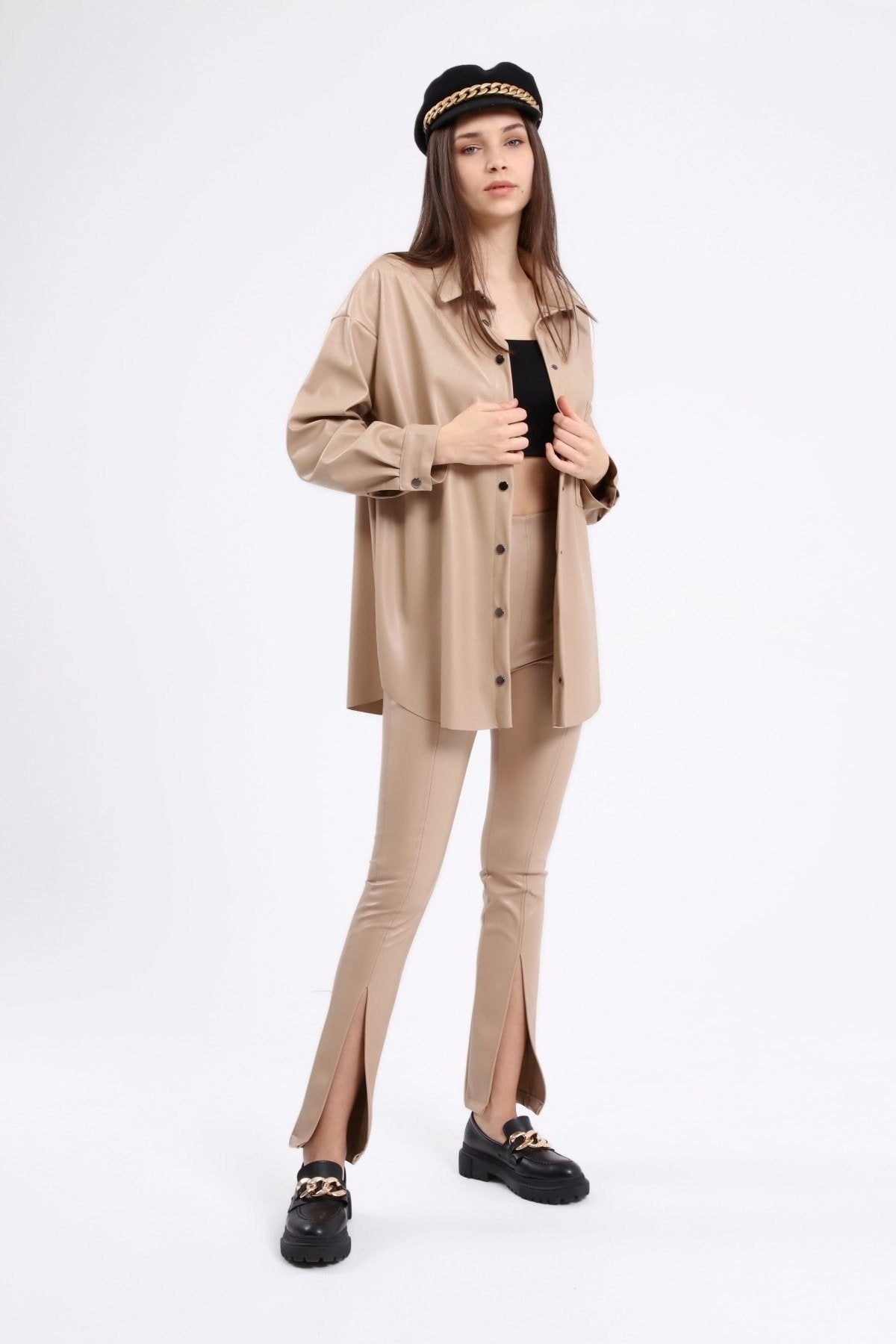 Yırtmaç detayı sayesinde hareket özgürlüğü sunar ve şık bir görünüm sağlar; Her yaş grubuna hitap eden tasarımıyla geniş bir kullanıcı yelpazesine sahiptir; Sade ve düz deseniyle kolayca kombinlenebilir, zamansız bir stil oluşturur; Suni deri materyali ile dayanıklılık ve konforu bir arada sunar; Yüksek bel tasarımı sayesinde vücut hatlarını zarifçe sarar ve şık bir siluet oluşturur; Şardonlu yapısı ile yumuşak dokunuşu ve rahatlığı ön plana çıkarır; Suni deriden üretilmiş kumaşı, uzun süreli kullanım için idealdir ve kolay bakım imkanı sunar; Regular boy kesimi ile farklı vücut tiplerine uyum sağlar ve rahat bir kullanım sunar; %95 polyester ve %5 elastan karışımından oluşan materyal bileşeni esneklik ve dayanıklılık vaat eder; Trend stil anlayışını yansıtan tasarımıyla güncel moda akımlarıyla uyumlu bir görünüm kazandırır;
