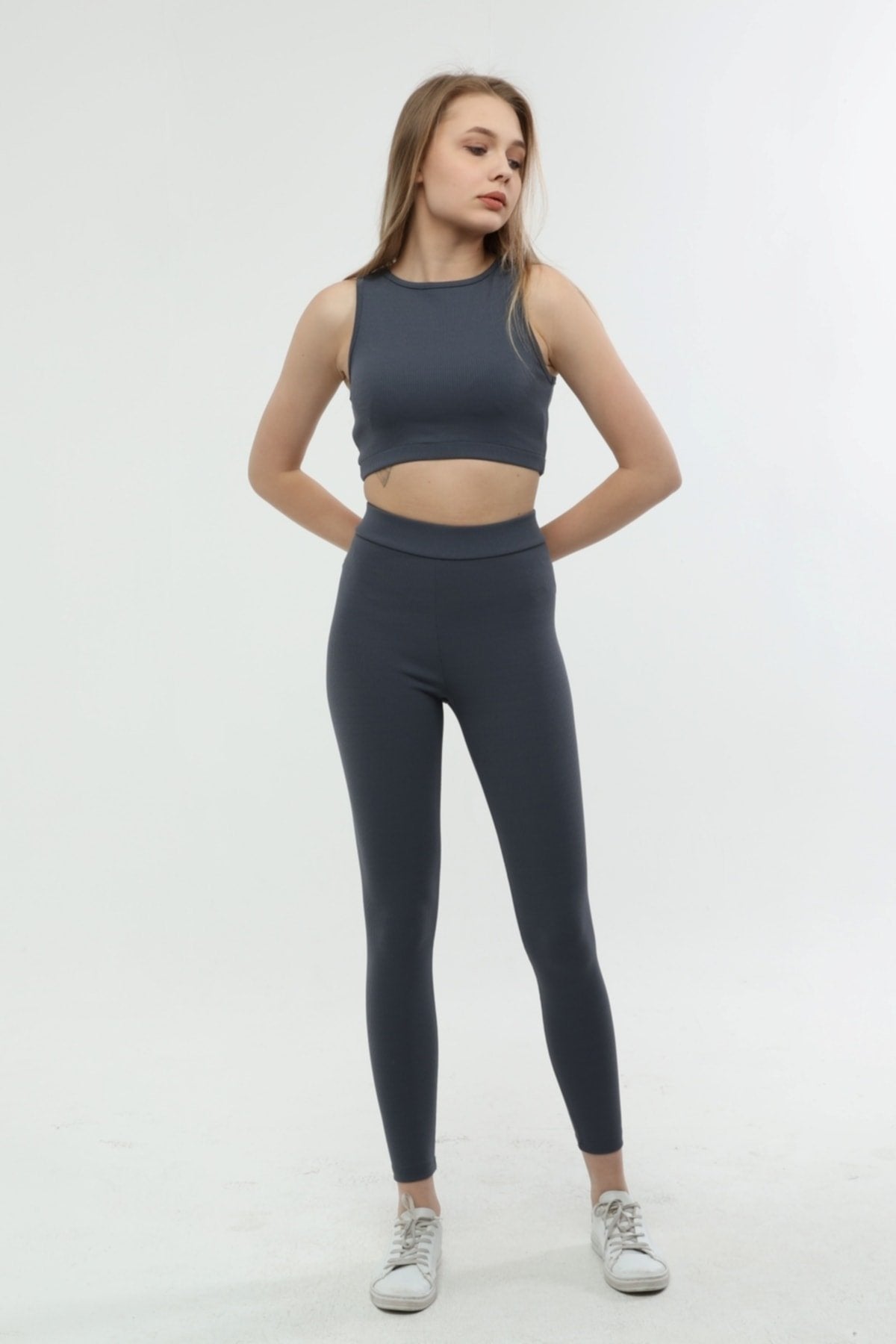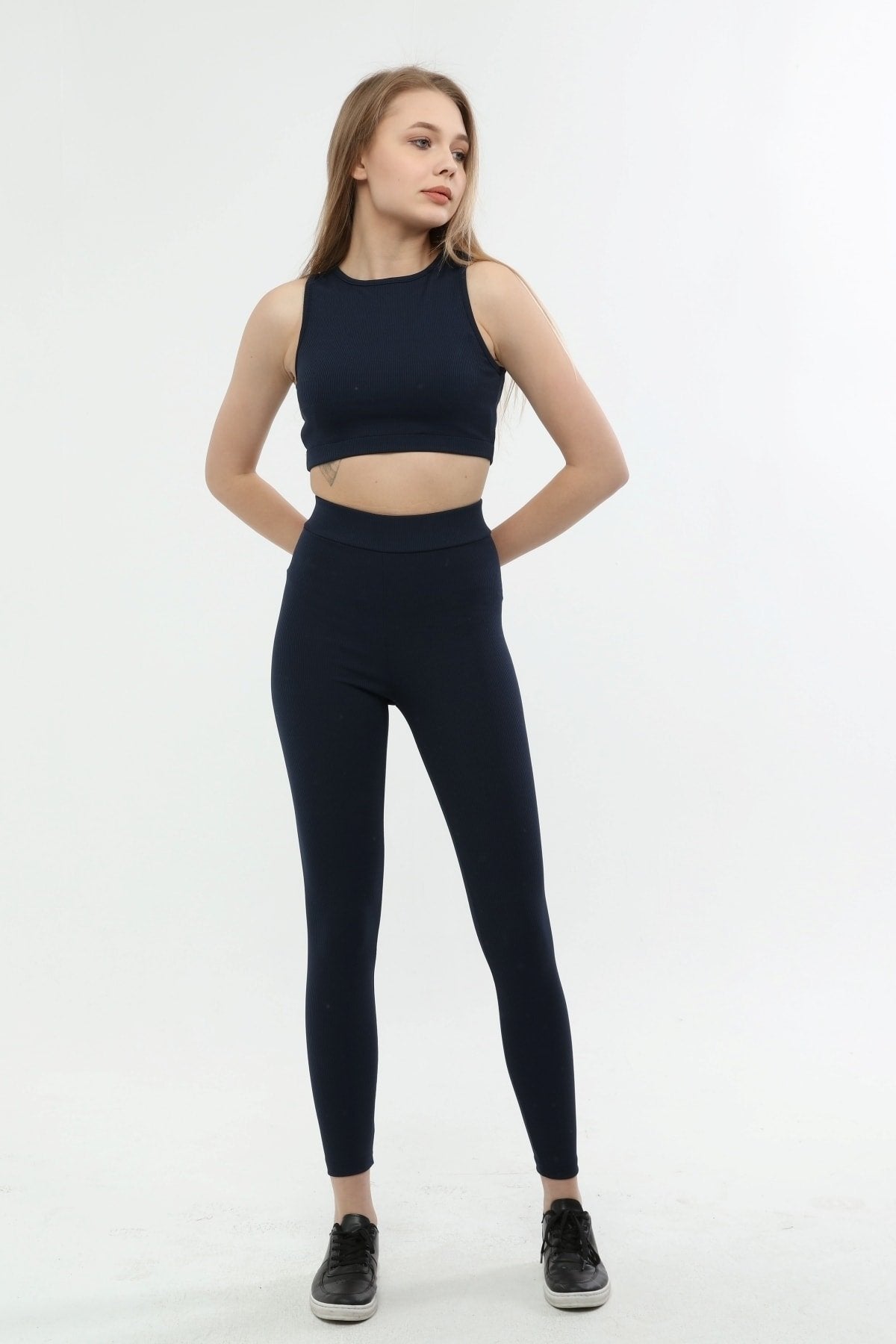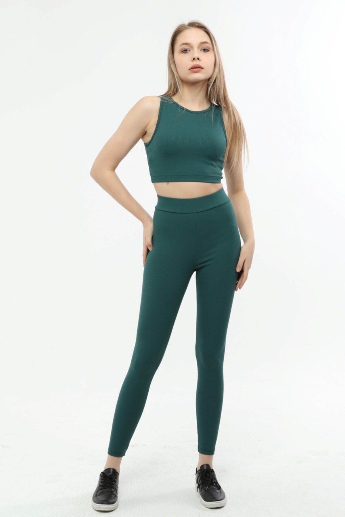 Kumaş içeriği: %83 Polyester %17 Elastan; 30 derecede yıkanır, ütü yapılmaz; Modelin üzerindeki beden S/36’dır.