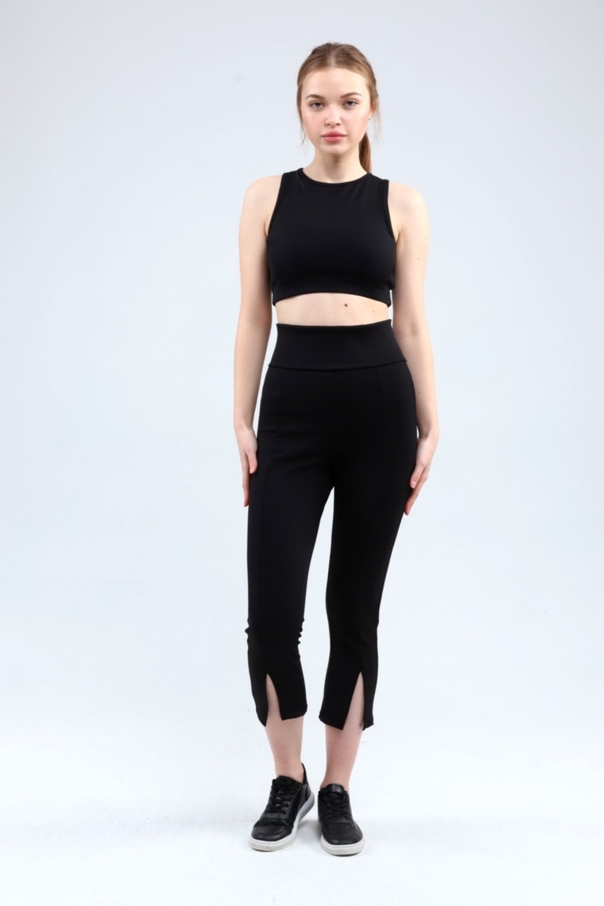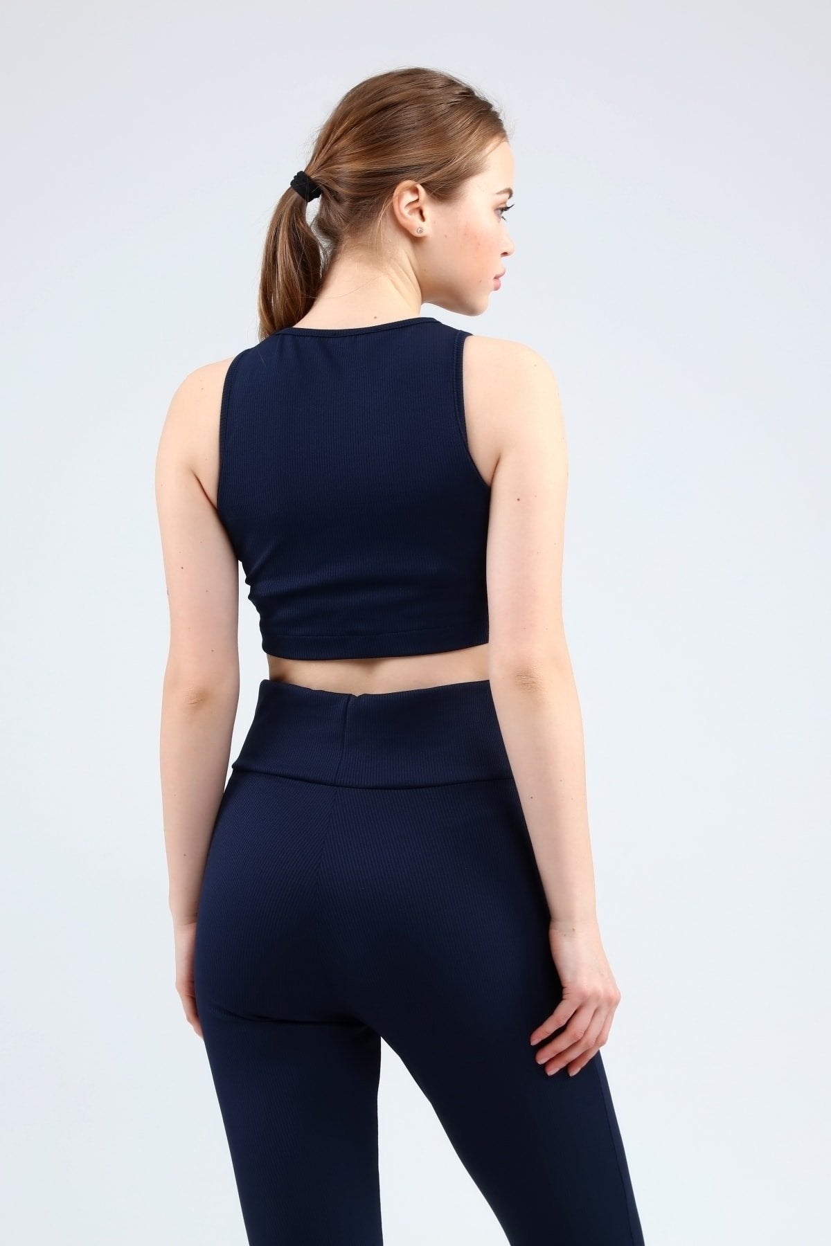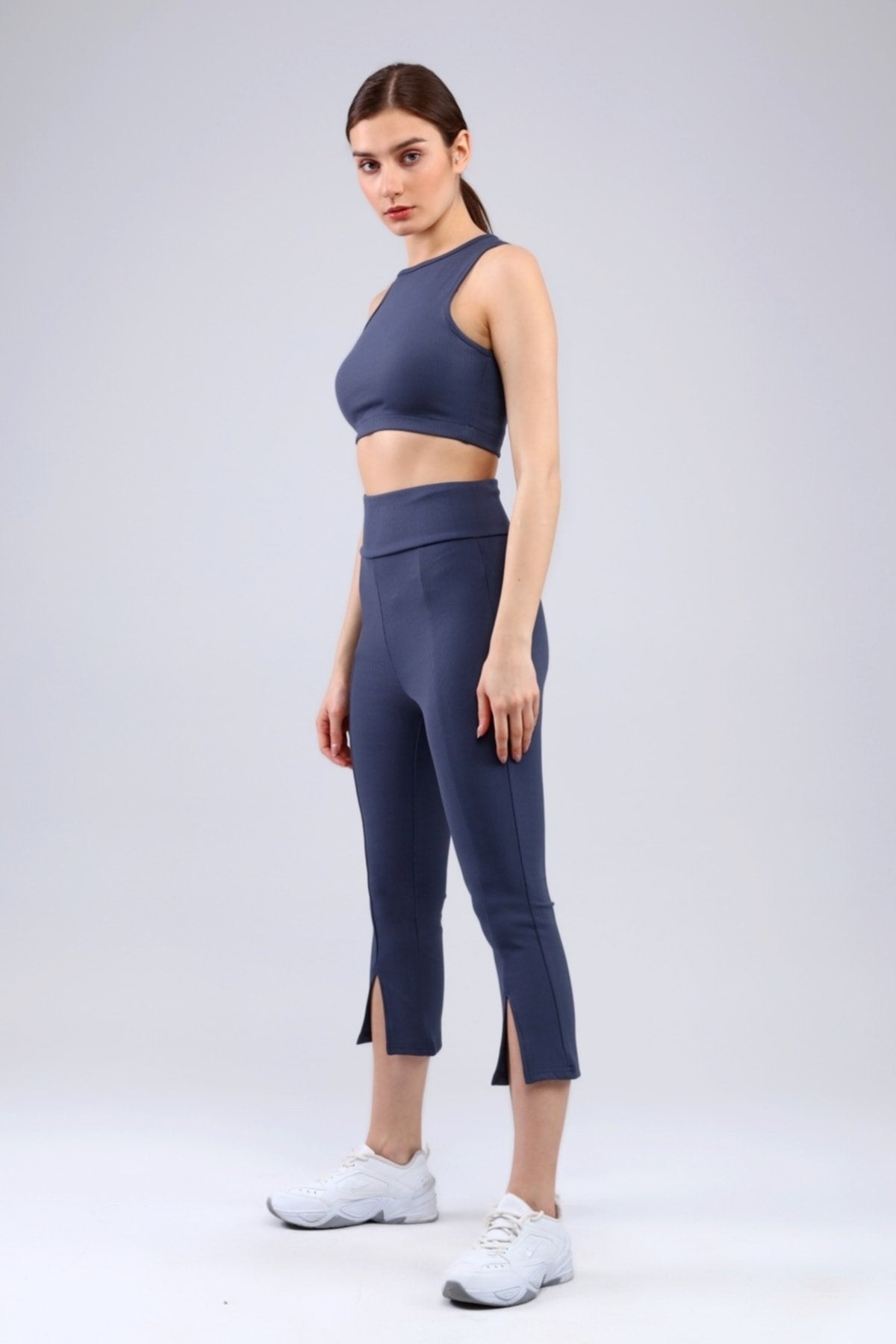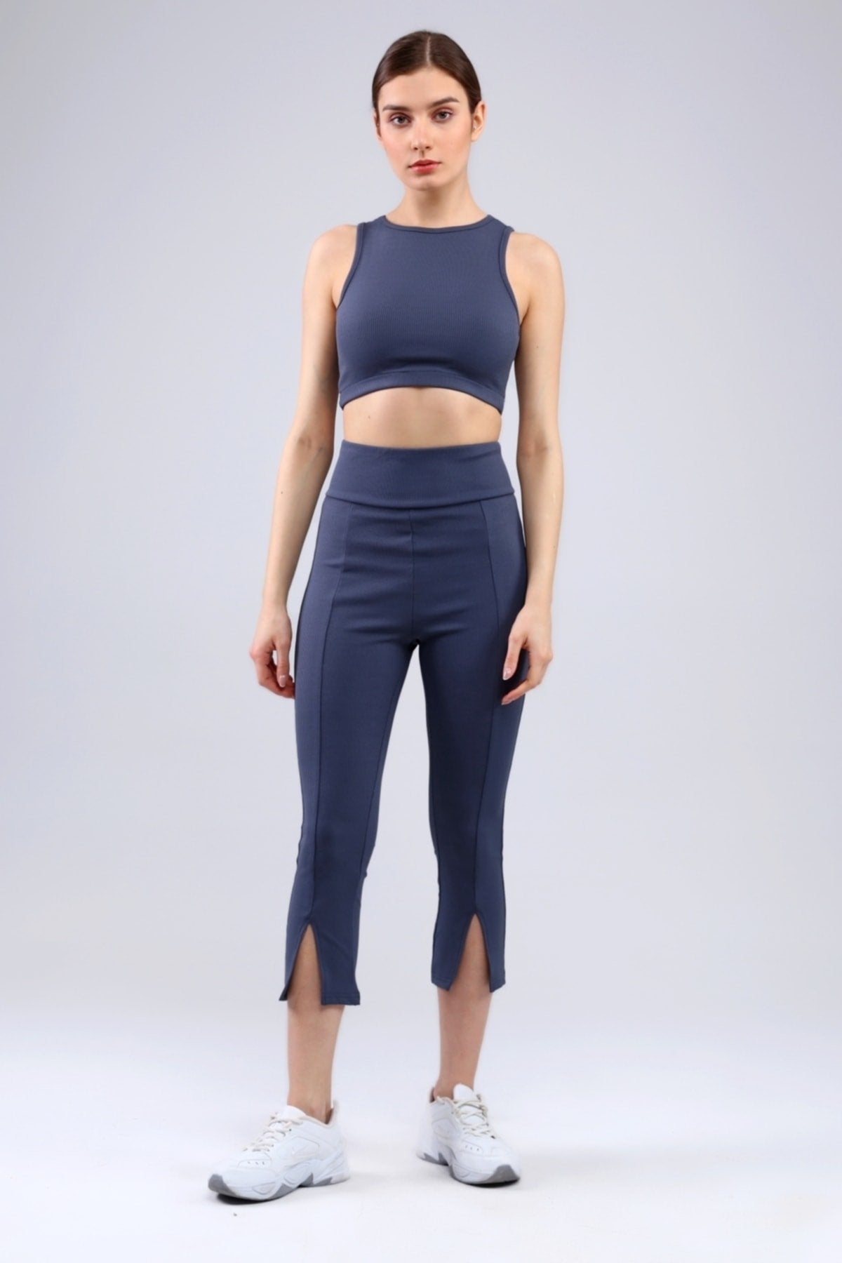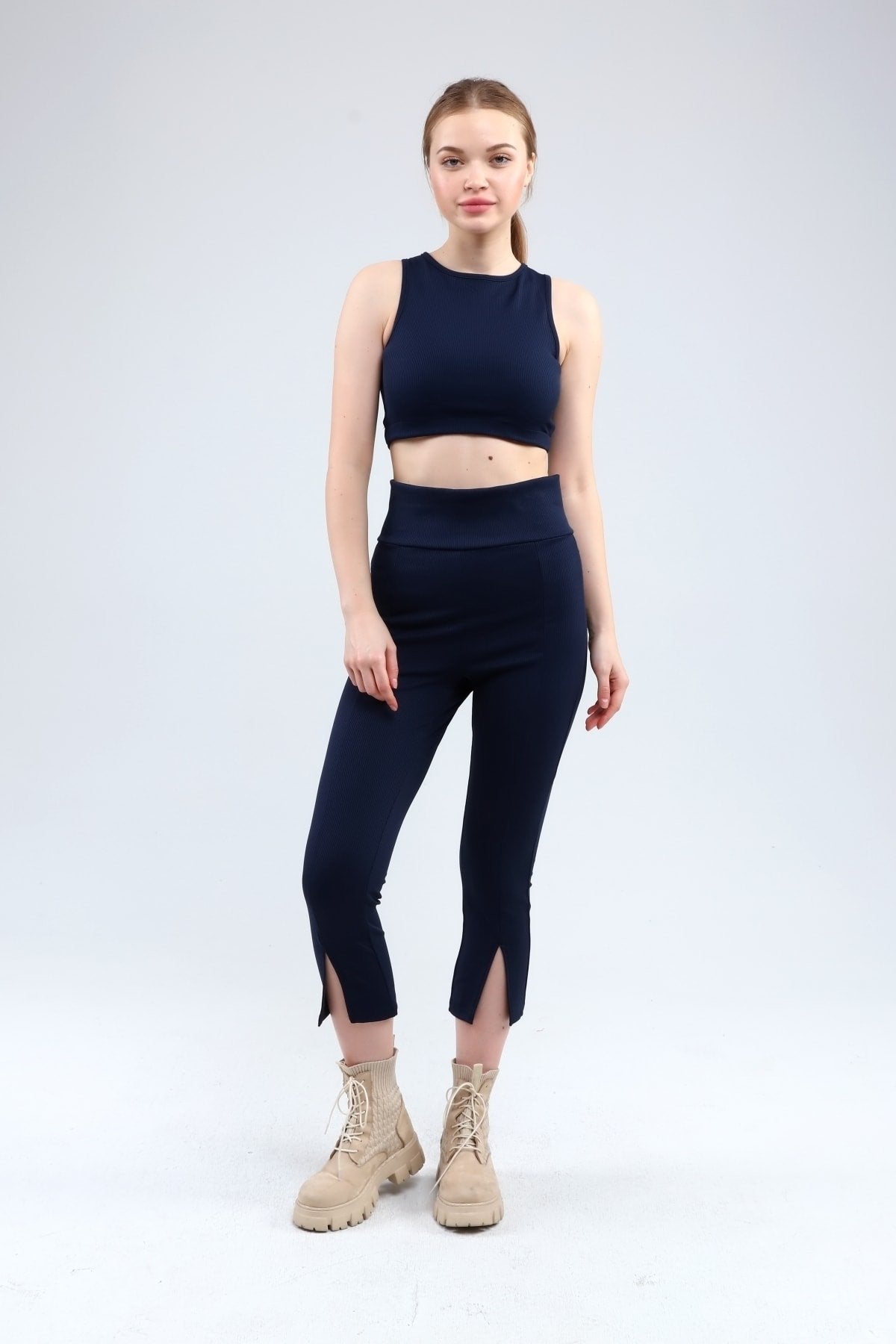 Lacivert Fitilli Kısa Paça Ön Yırtmaçlı Yüksek Bel Toparlayıcı Tayt