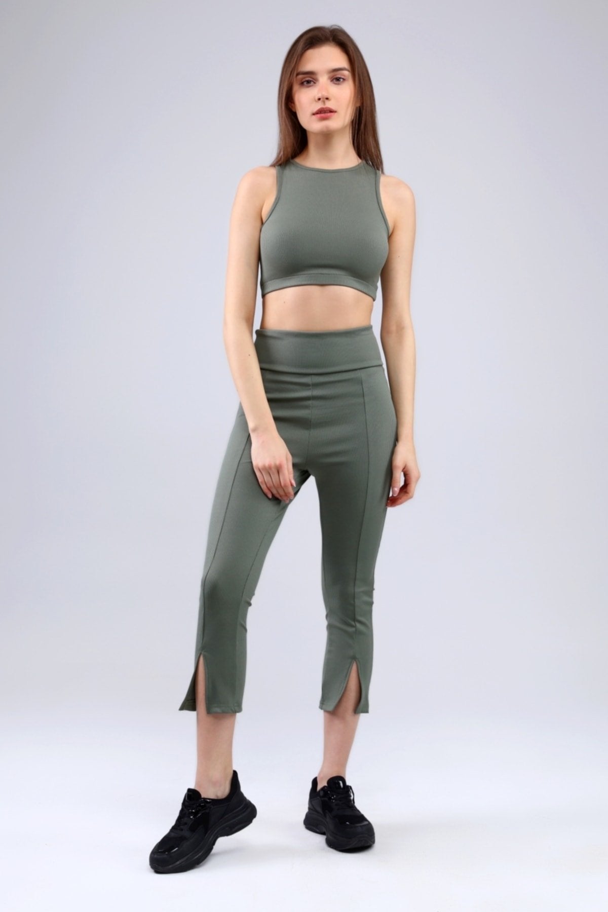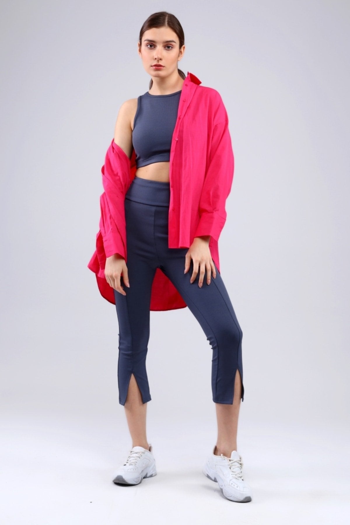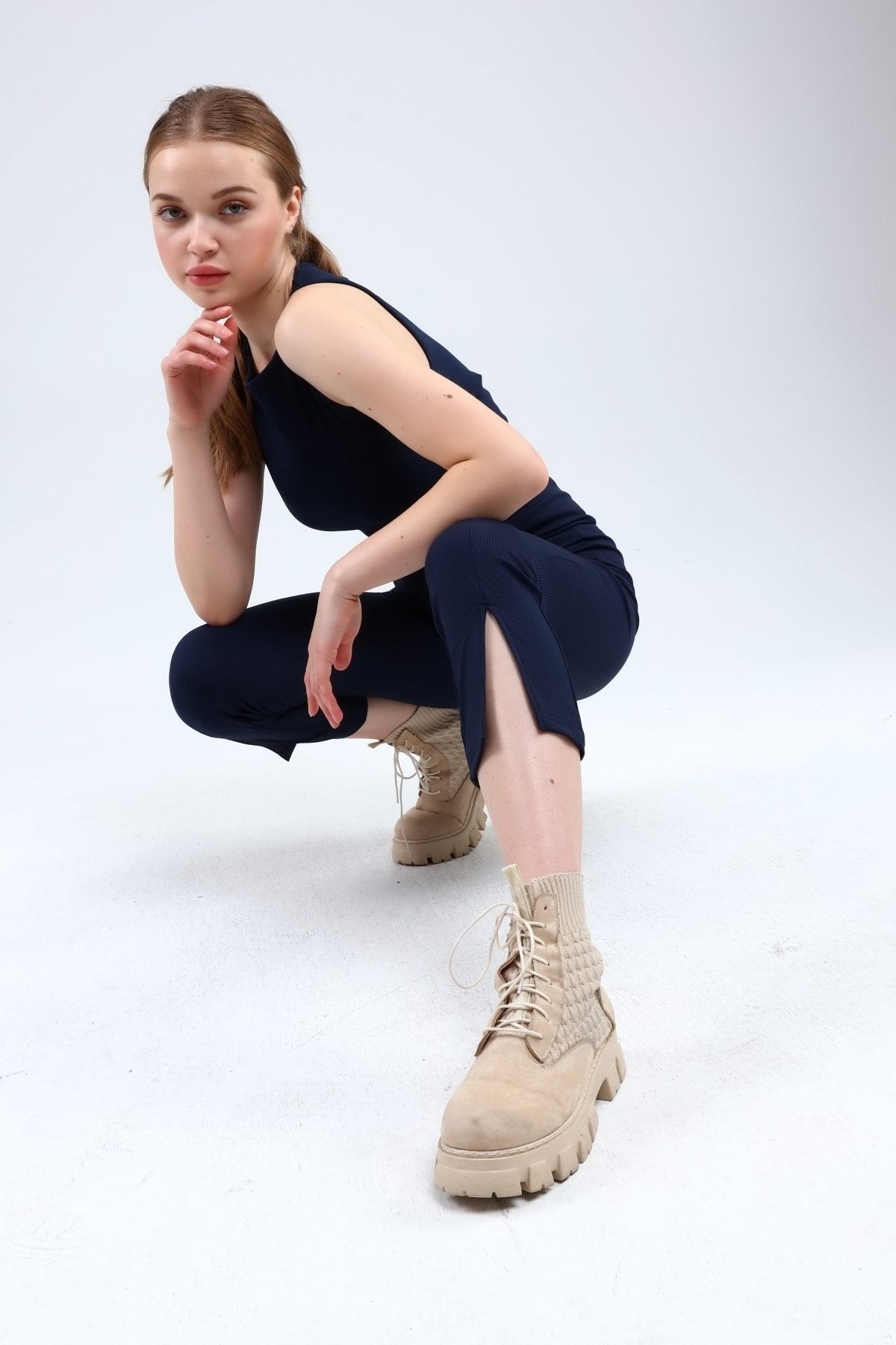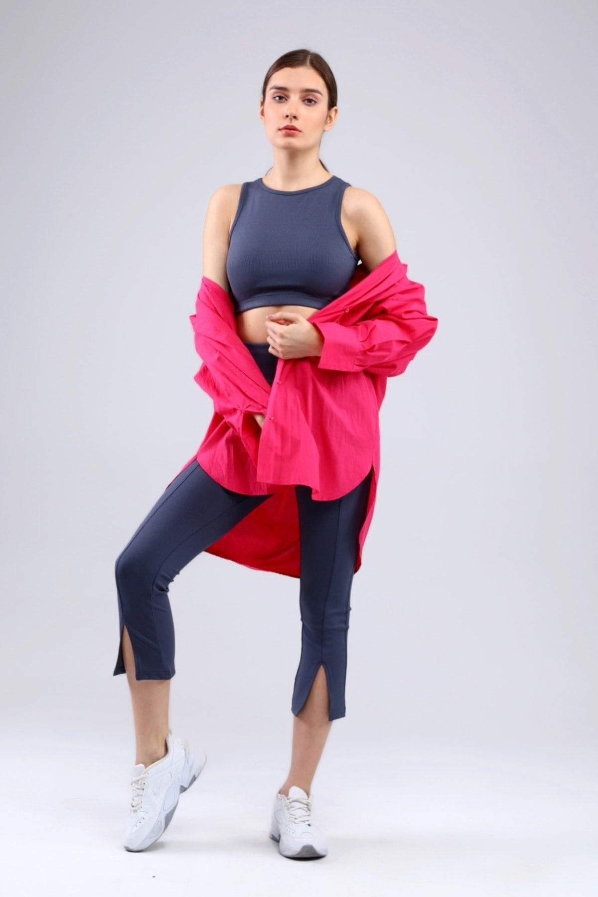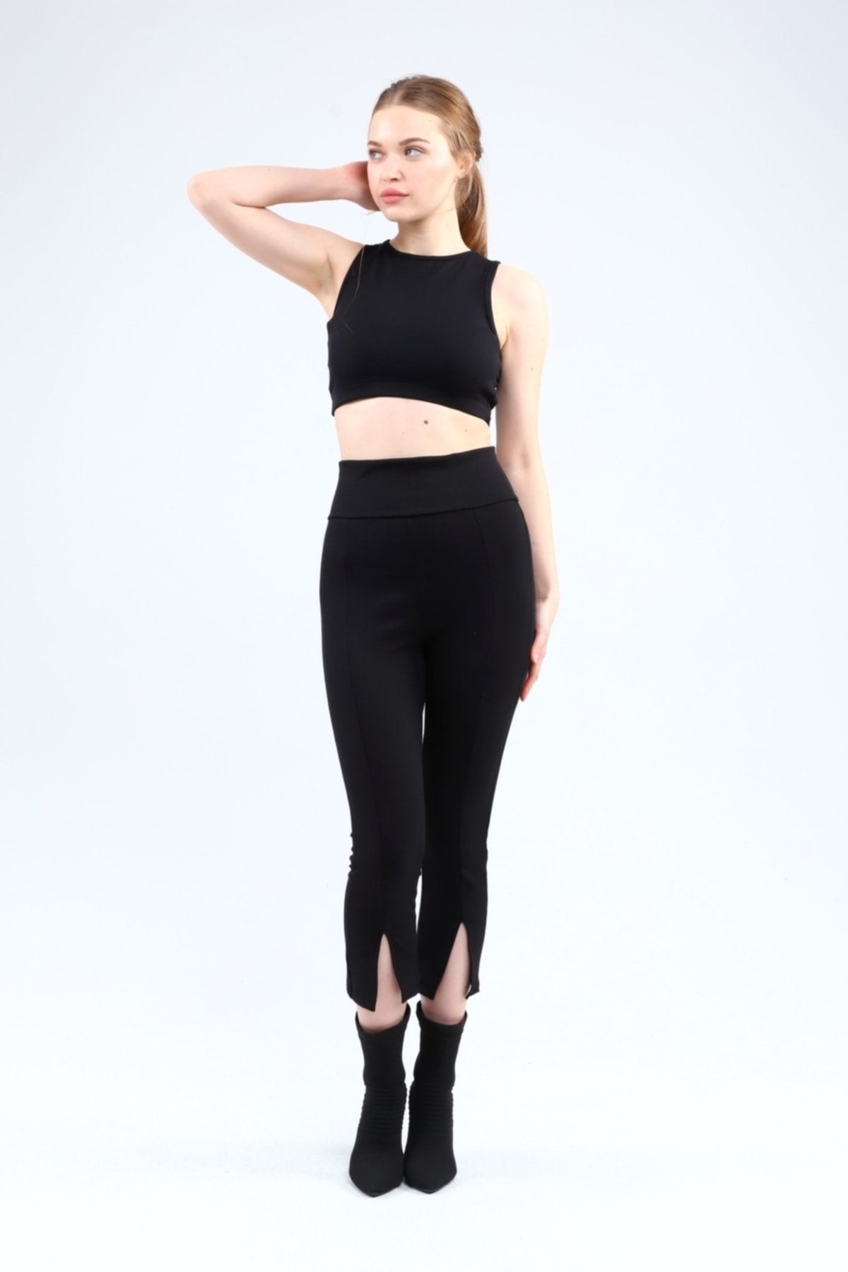 Lacivert Fitilli Kısa Paça Ön Yırtmaçlı Yüksek Bel Toparlayıcı Tayt
