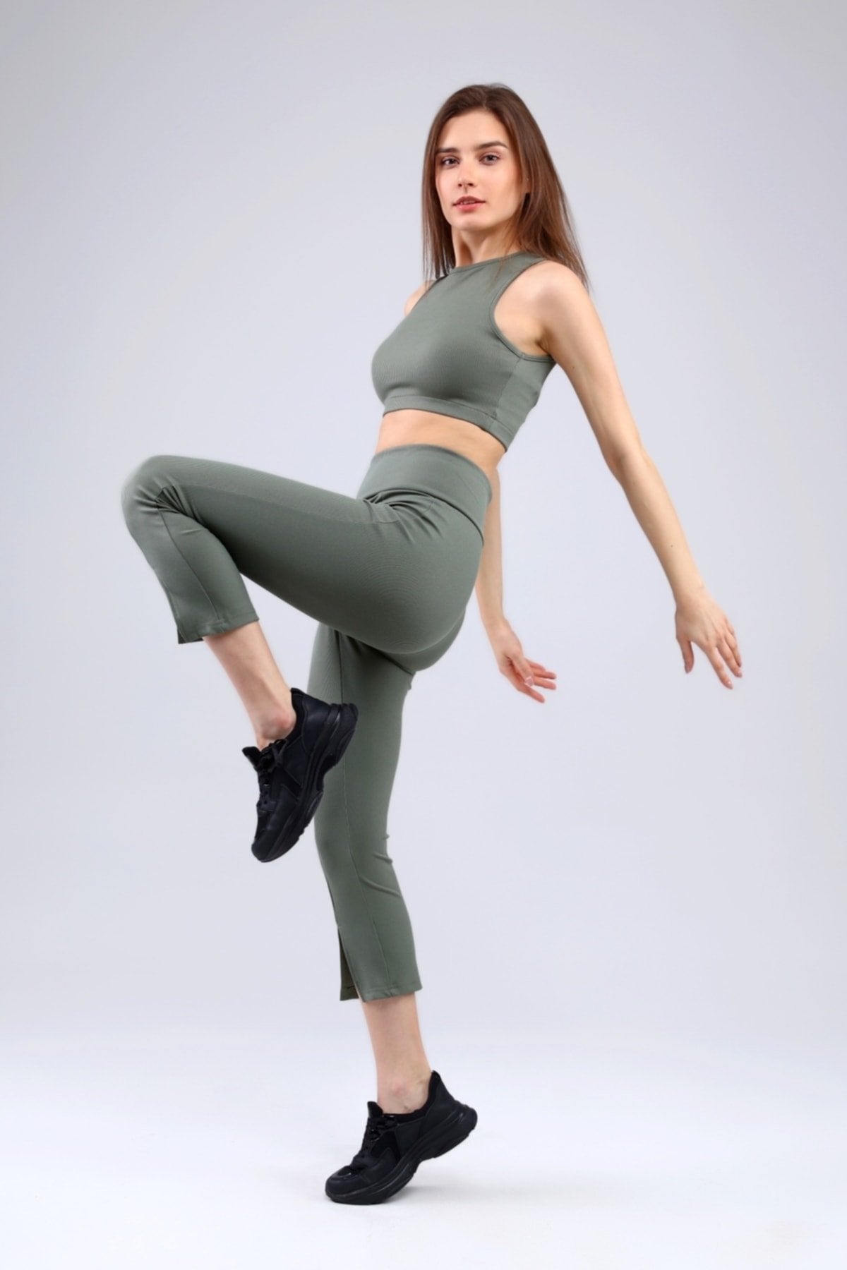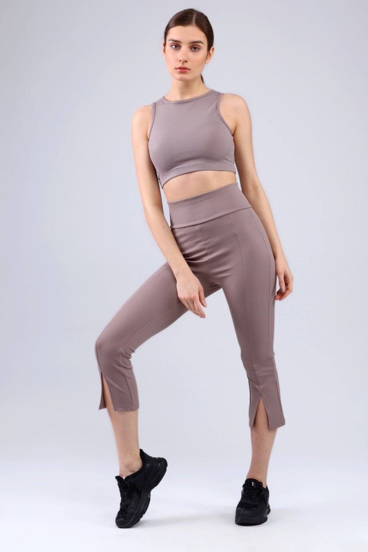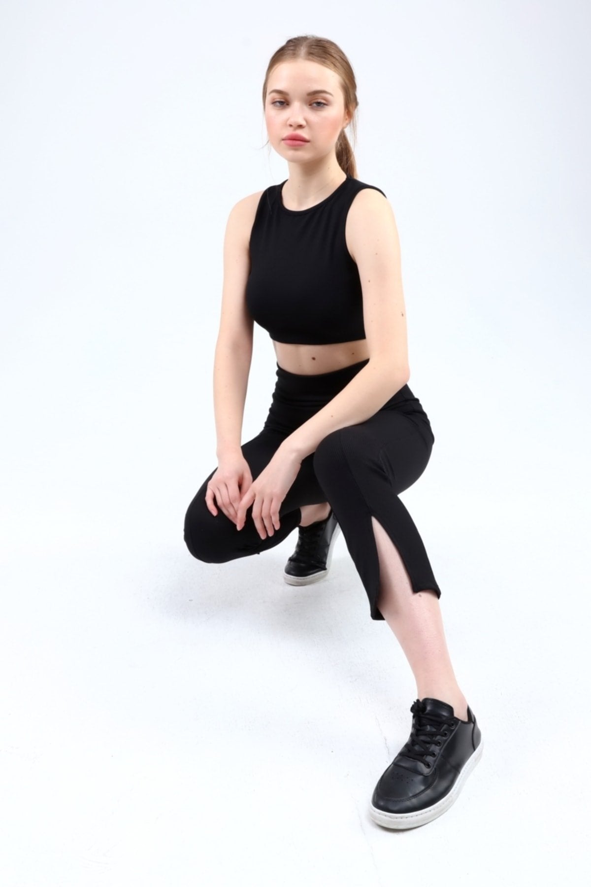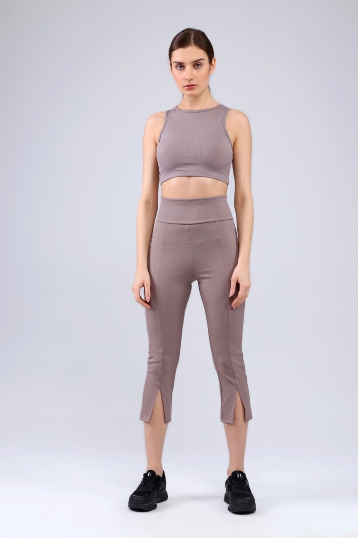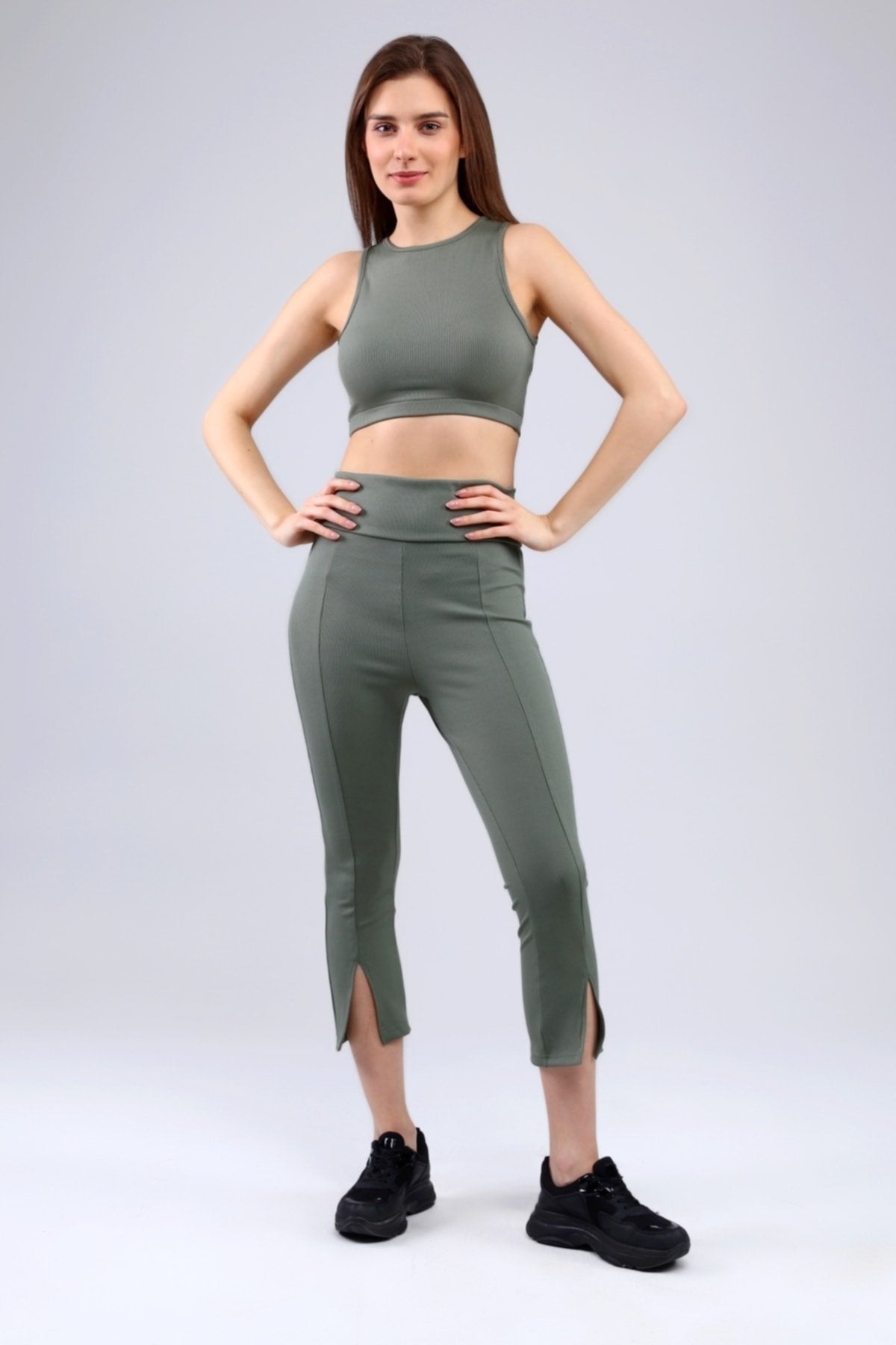 Lacivert Fitilli Kısa Paça Ön Yırtmaçlı Yüksek Bel Toparlayıcı Tayt