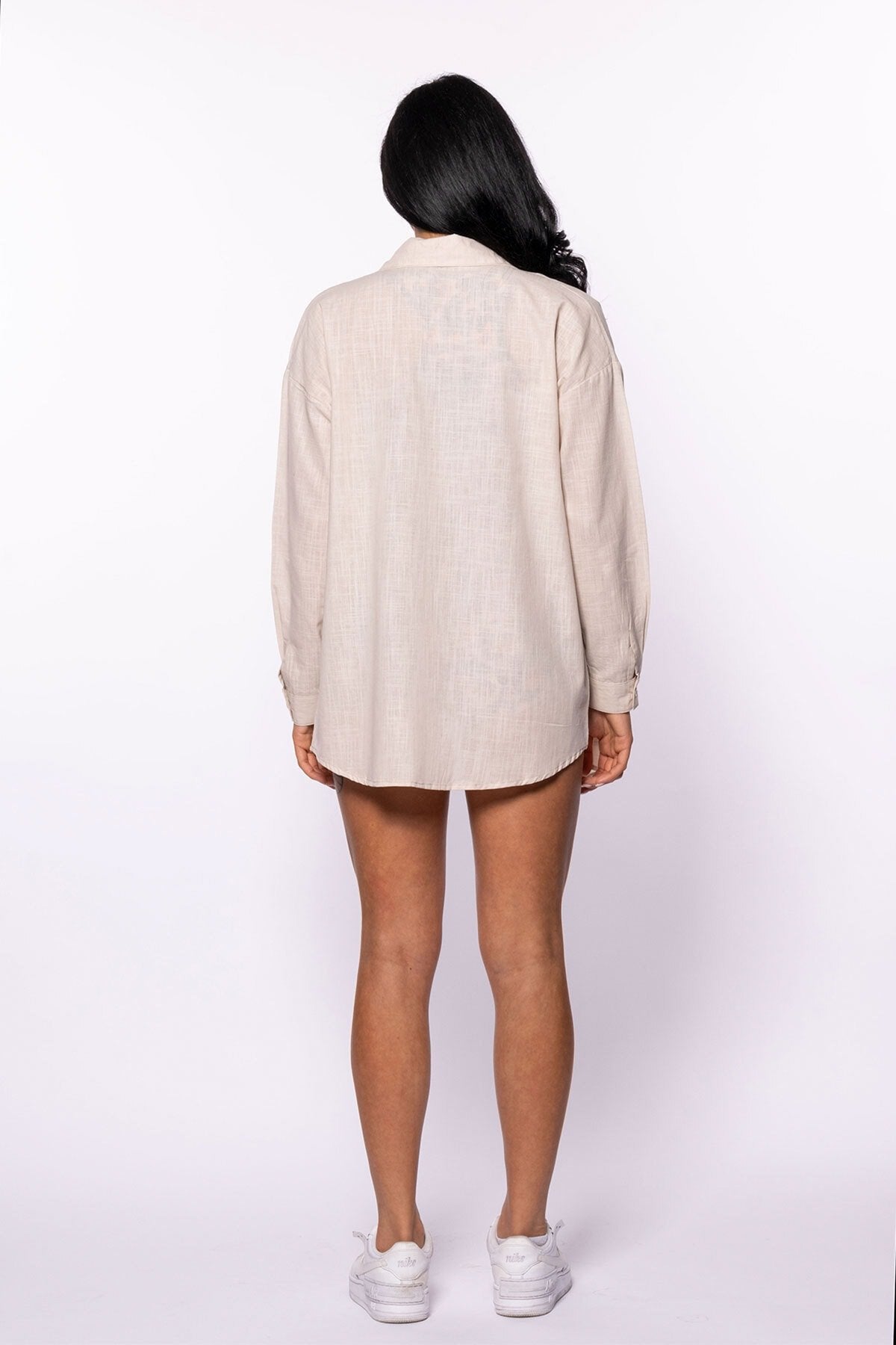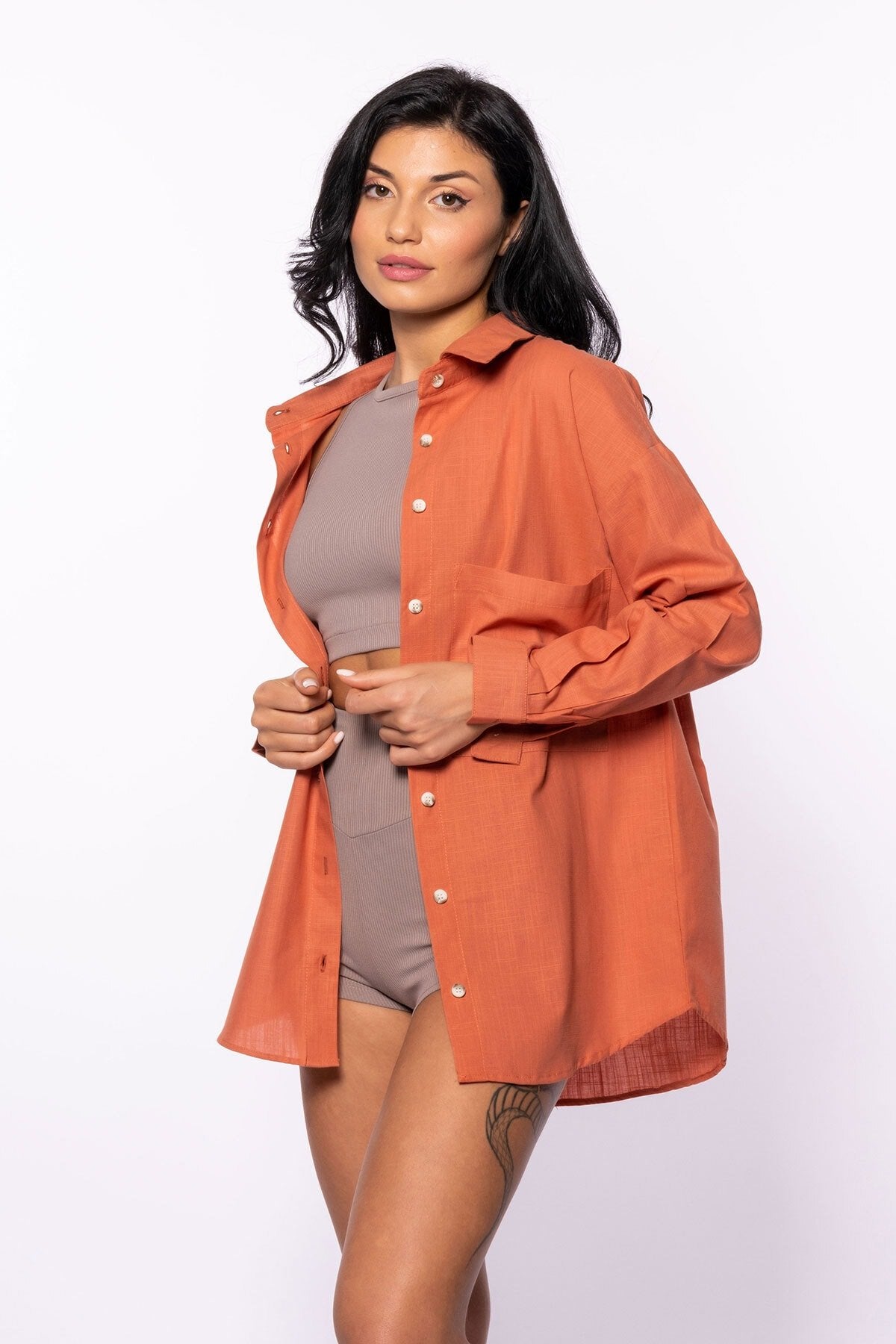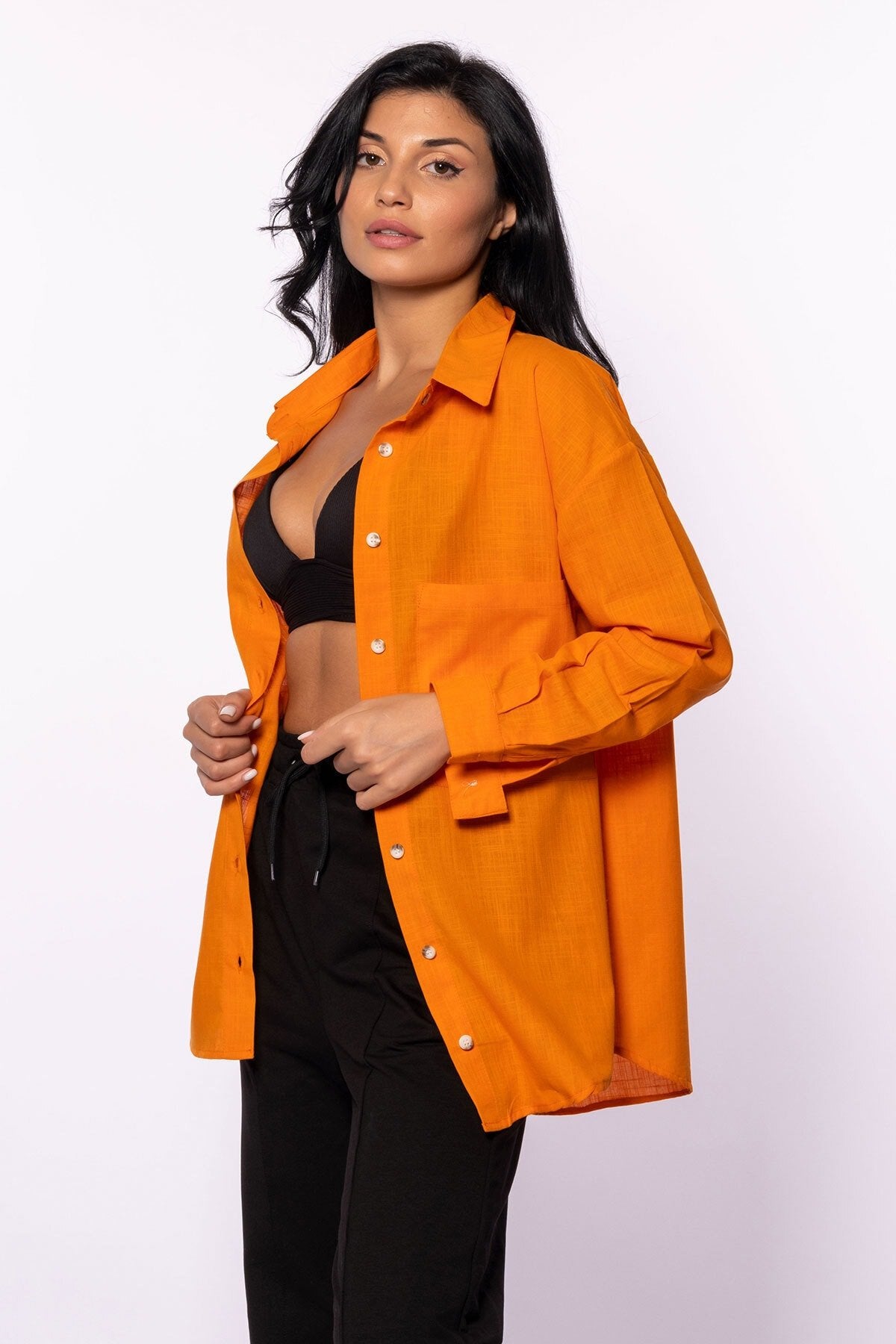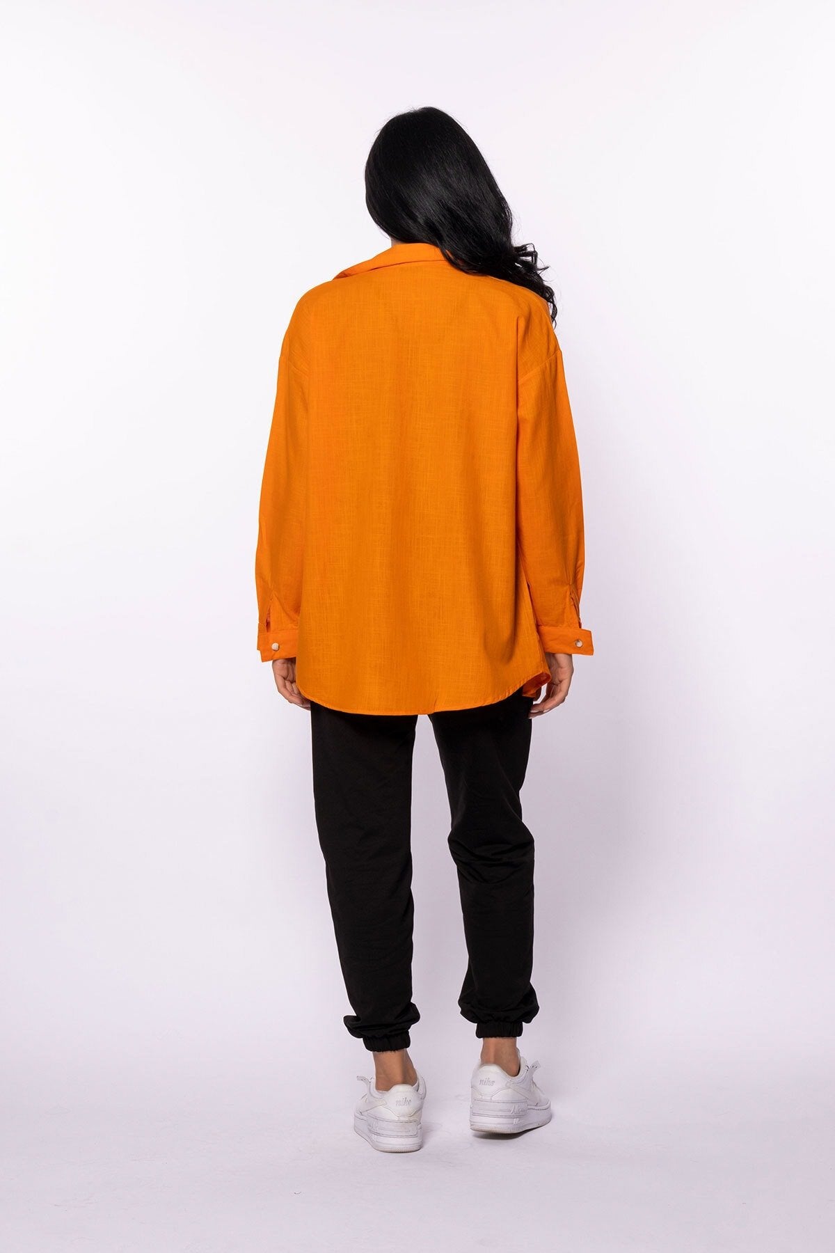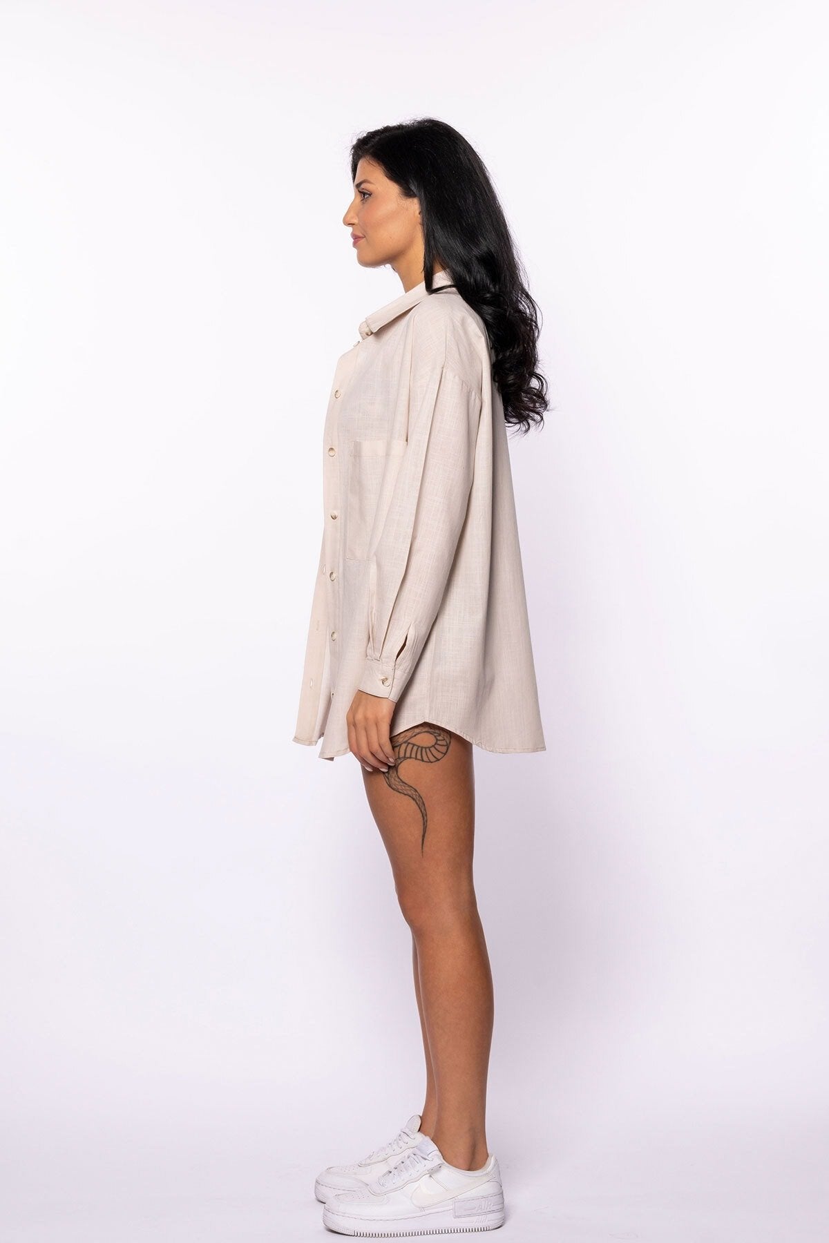 Flamlı kumaş yapısı ile dikkat çeken bu gömlek, trend bir görünüm sunar ve günlük kullanımda rahatlık sağlar; Oversize kalıbı sayesinde modern ve şık bir tarz yaratırken, hareket özgürlüğü de sunar; Uzun boy tasarımı ile hem rahatlık hem de şıklığı bir arada sunarak, farklı kombinlerle uyum sağlar; Keten karışımlı materyali sayesinde hafif ve nefes alabilen bir yapıya sahiptir, sıcak yaz günlerinde serinlik hissi verir; Düğmeli kapama şekli pratik kullanım imkanı tanırken, gömleğin formunu korumasına yardımcı olur;