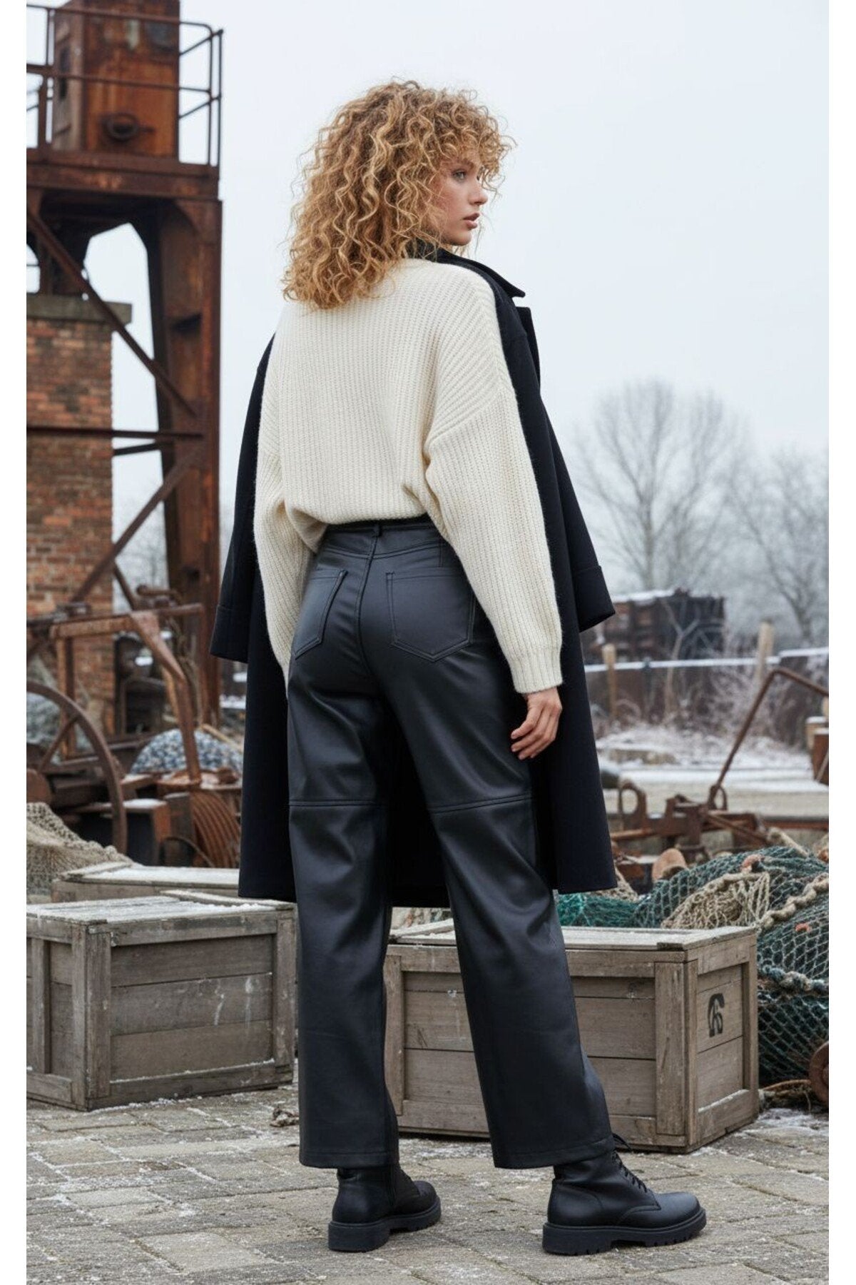 Relaxed Boru Paça Dikiş Detaylı Deri Pantolon