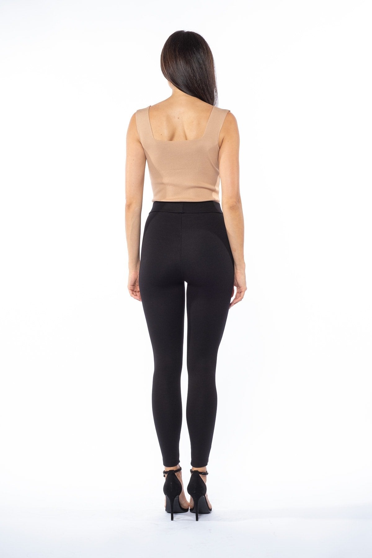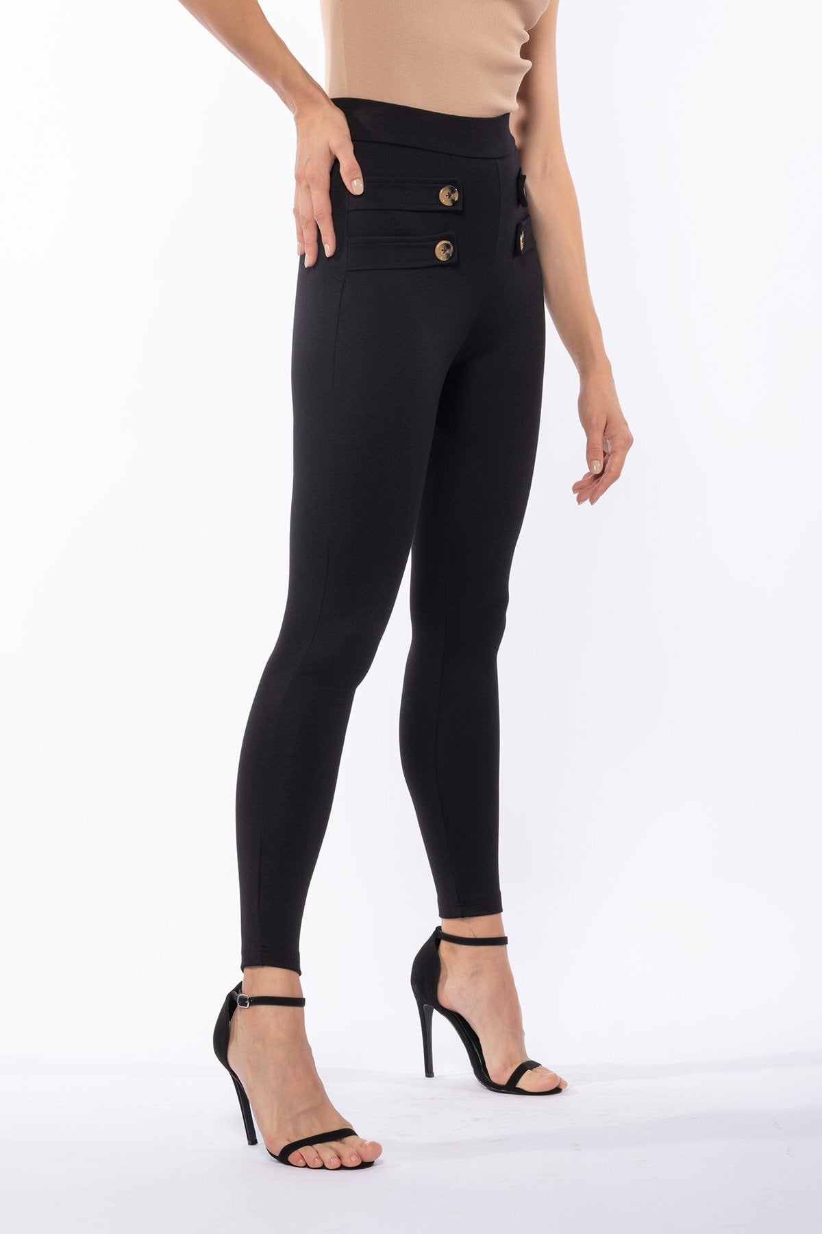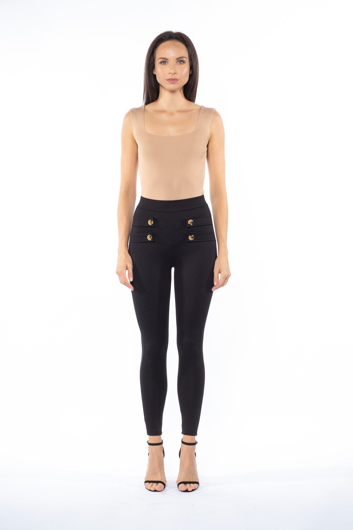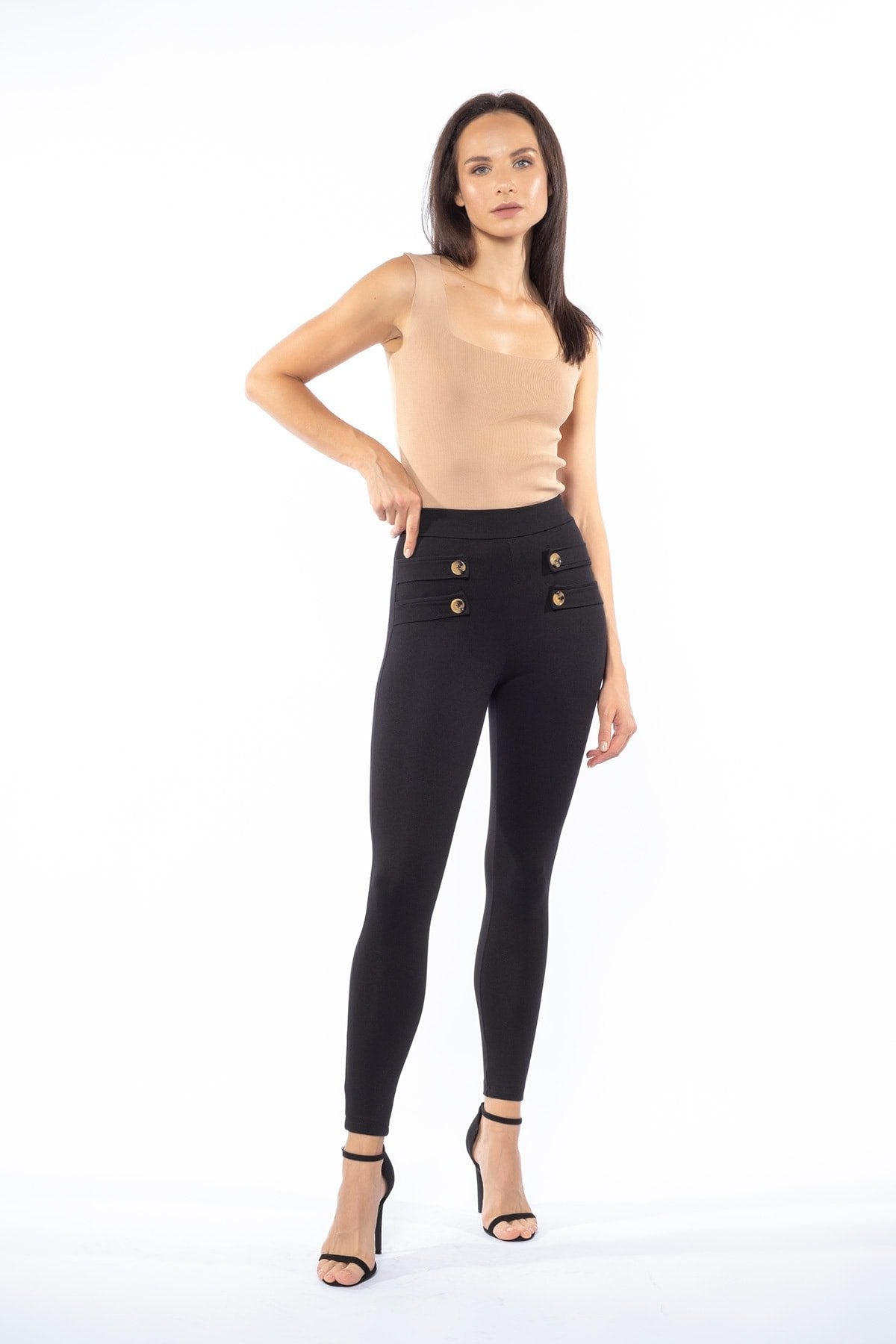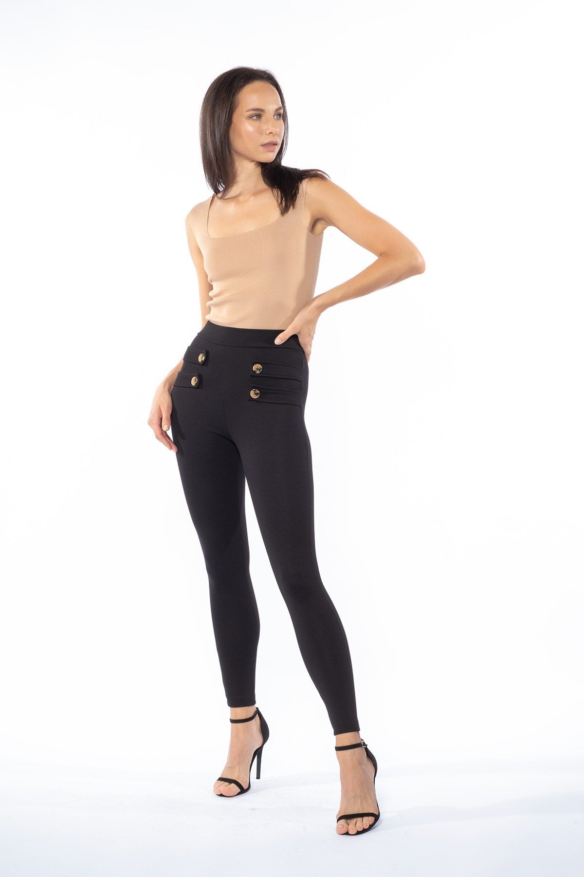 Siyah Apoletli Kemik Düğme Detaylı Yüksek Bel Toparlayıcı Kışlık Örme Tayt