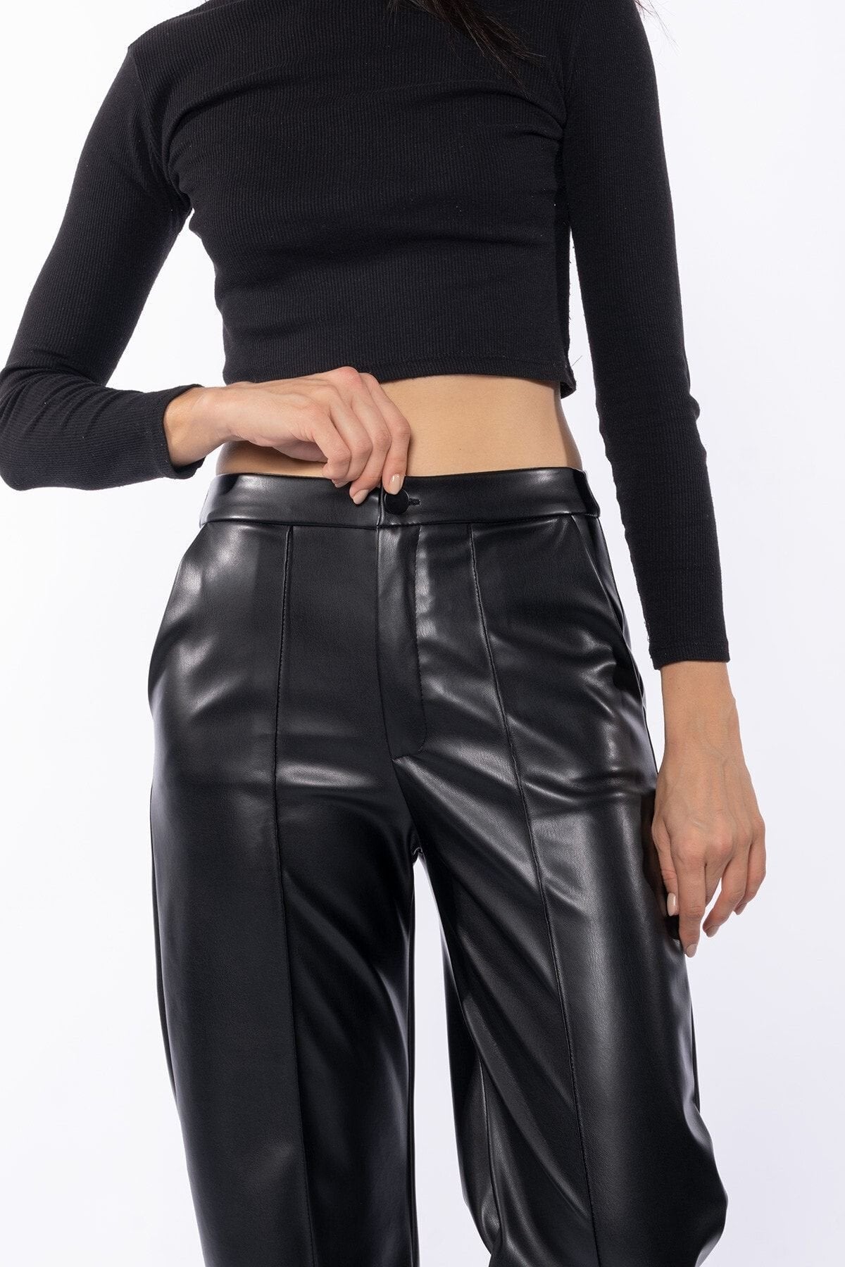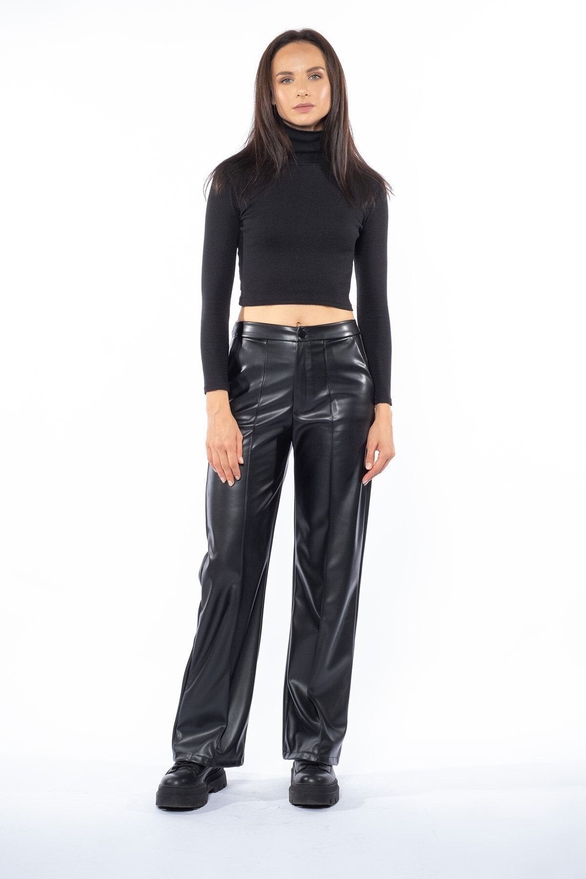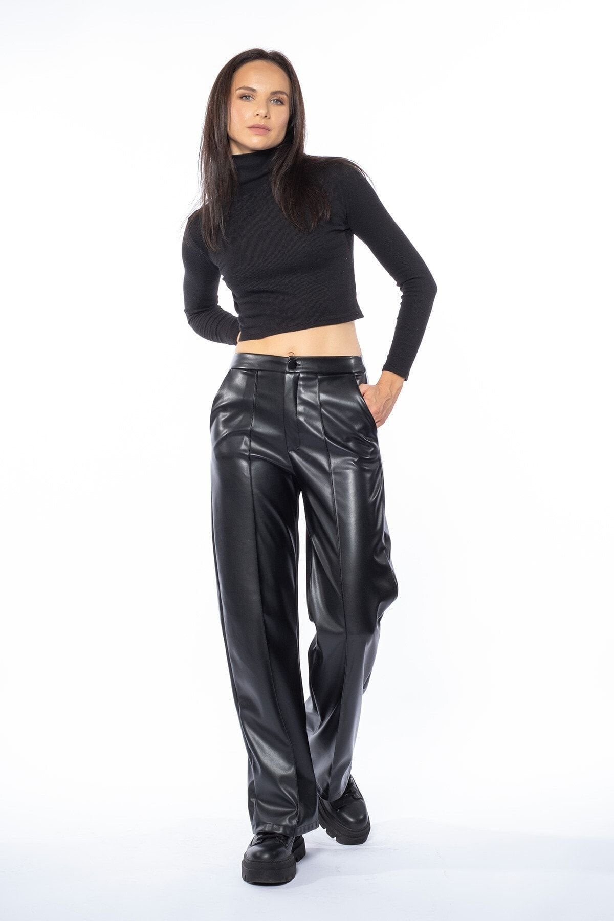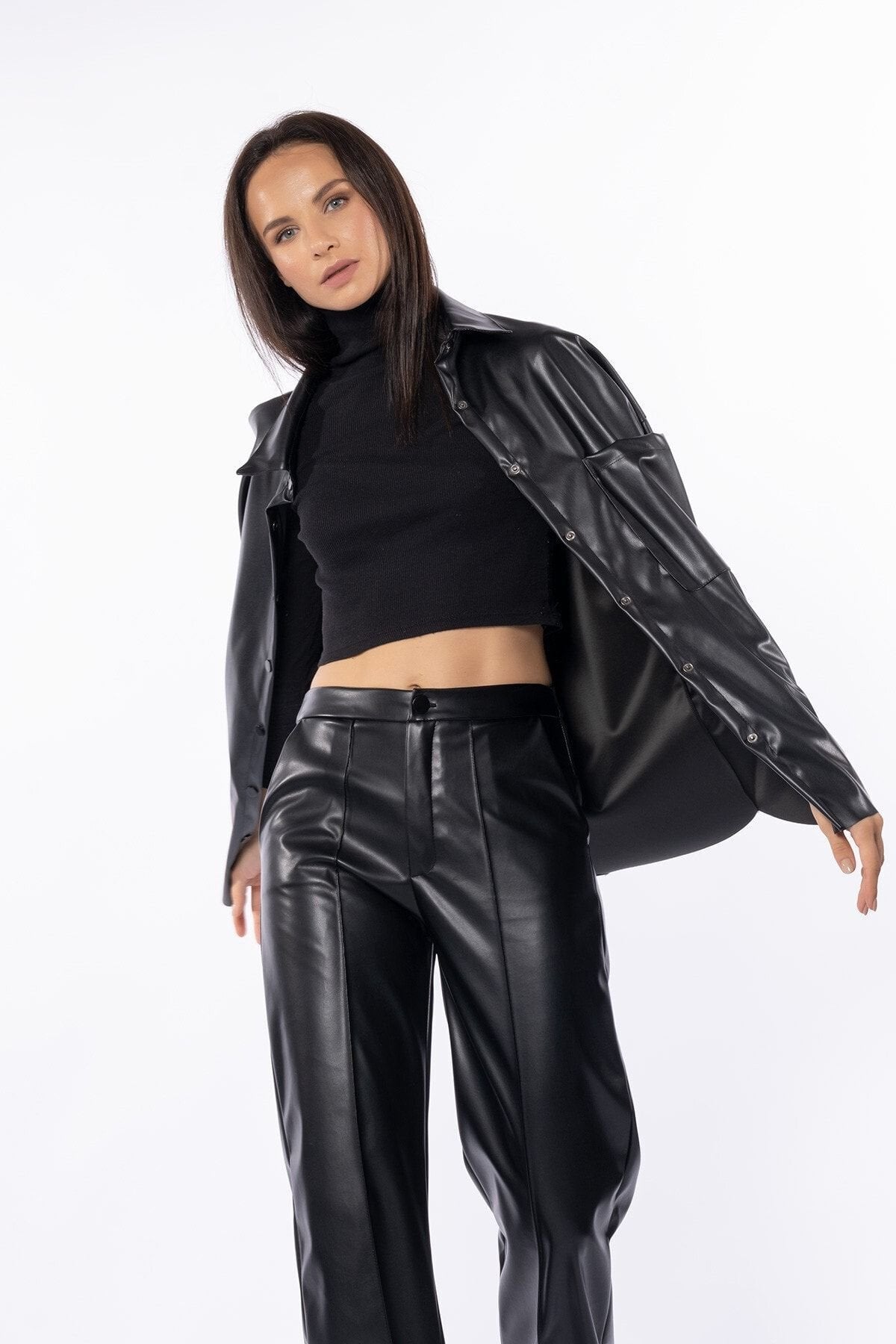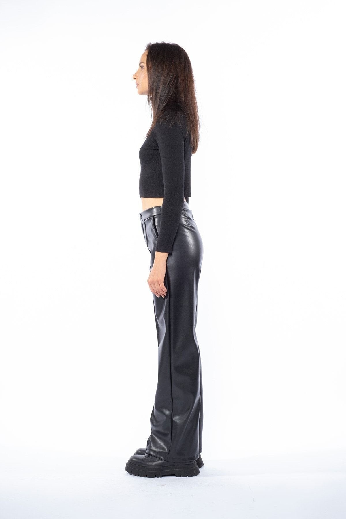 Siyah Deri Çıma Dikişli Ispanyol Paça Pantolon