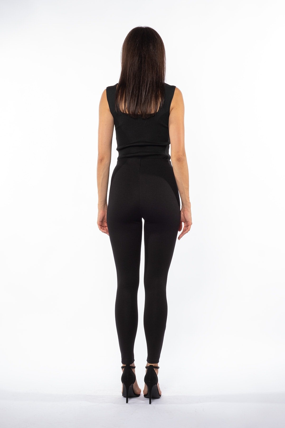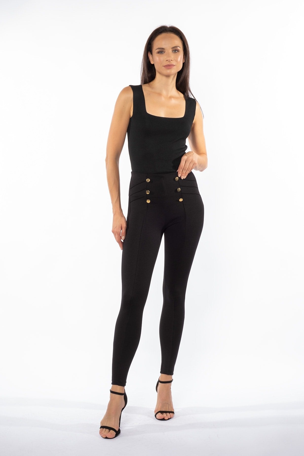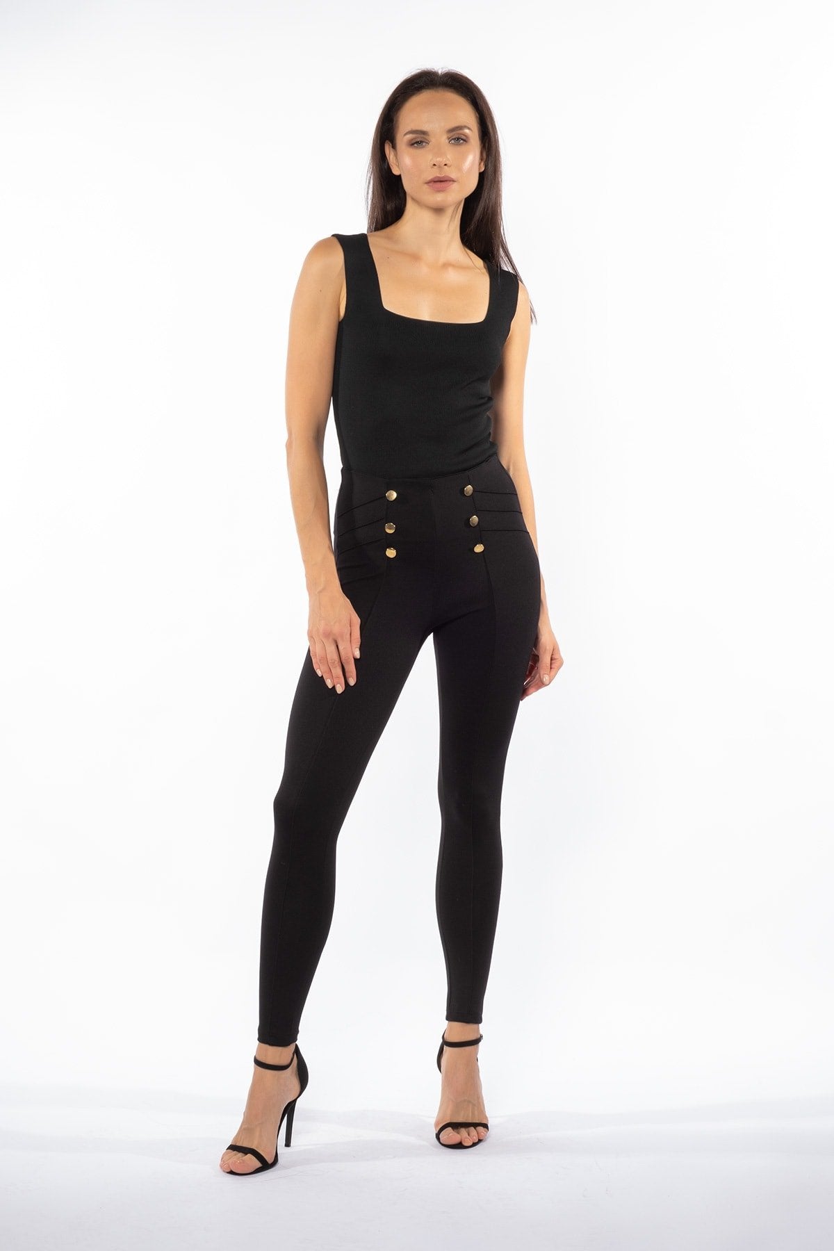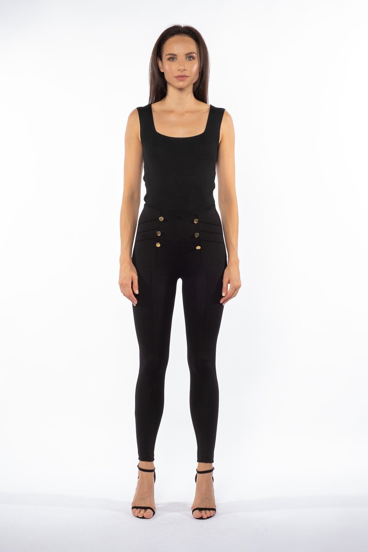 Siyah Gold Düğmeli Ve Çapraz Dikişli Yüksek Bel Toparlayıcı Kışlık Örme Tayt