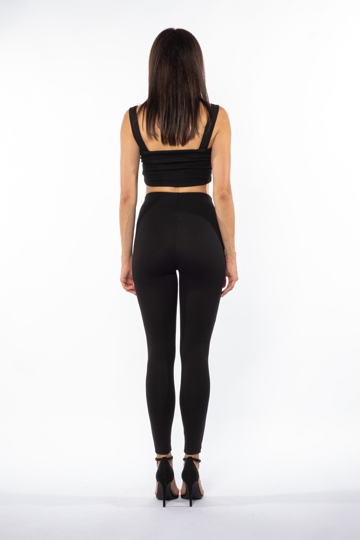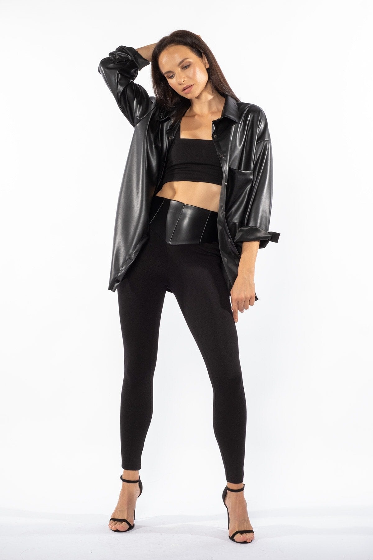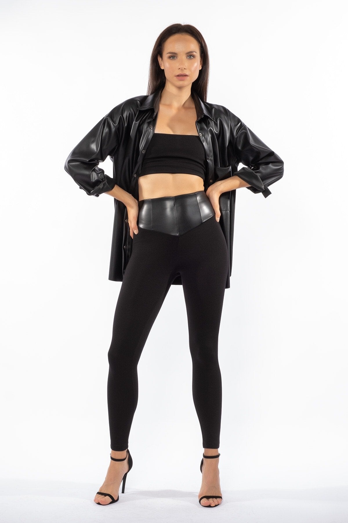 Siyah Kemeri Deri Detaylı Yüksek Bel Kışlık Örme Toparlayıcı Tayt
