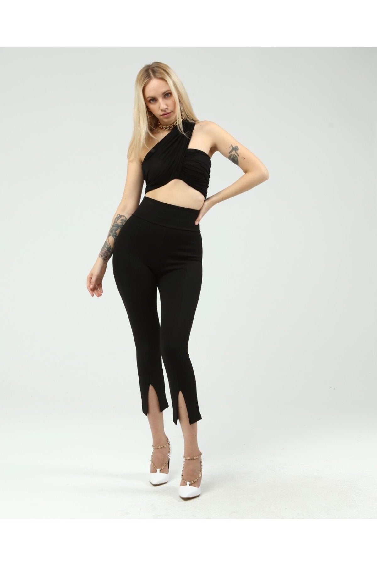 Siyah Kısa Paça Ön Yırtmaçlı Yüksek Bel Toparlayıcı Tayt
