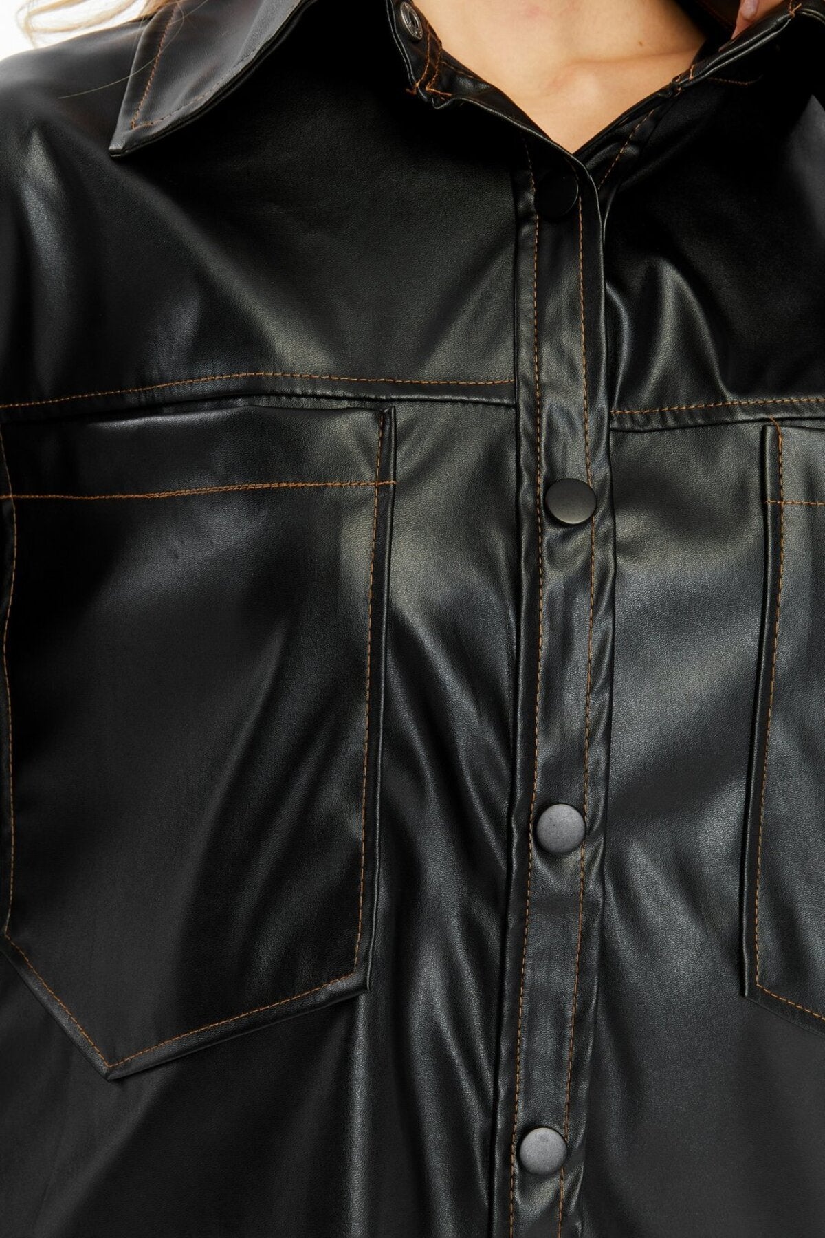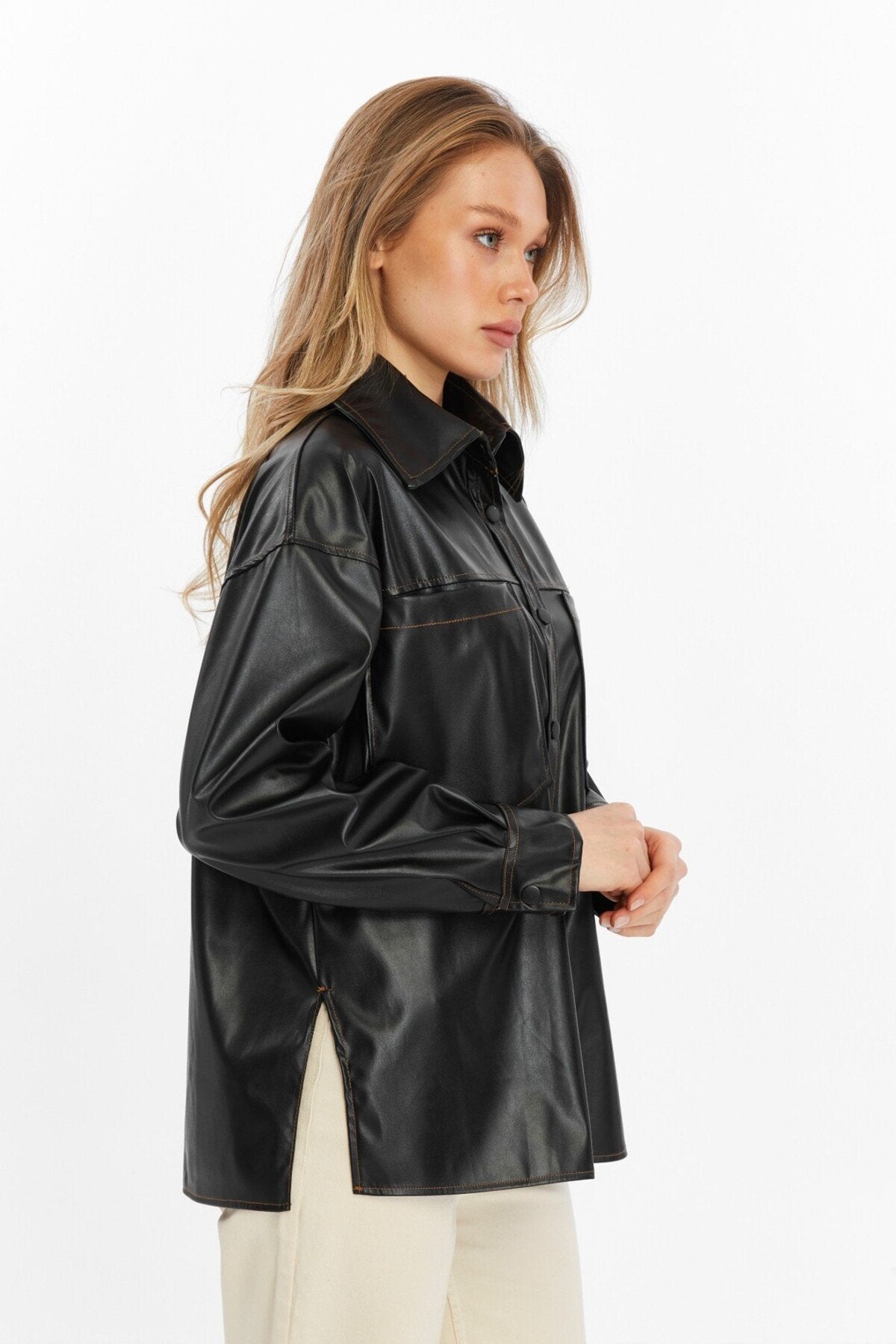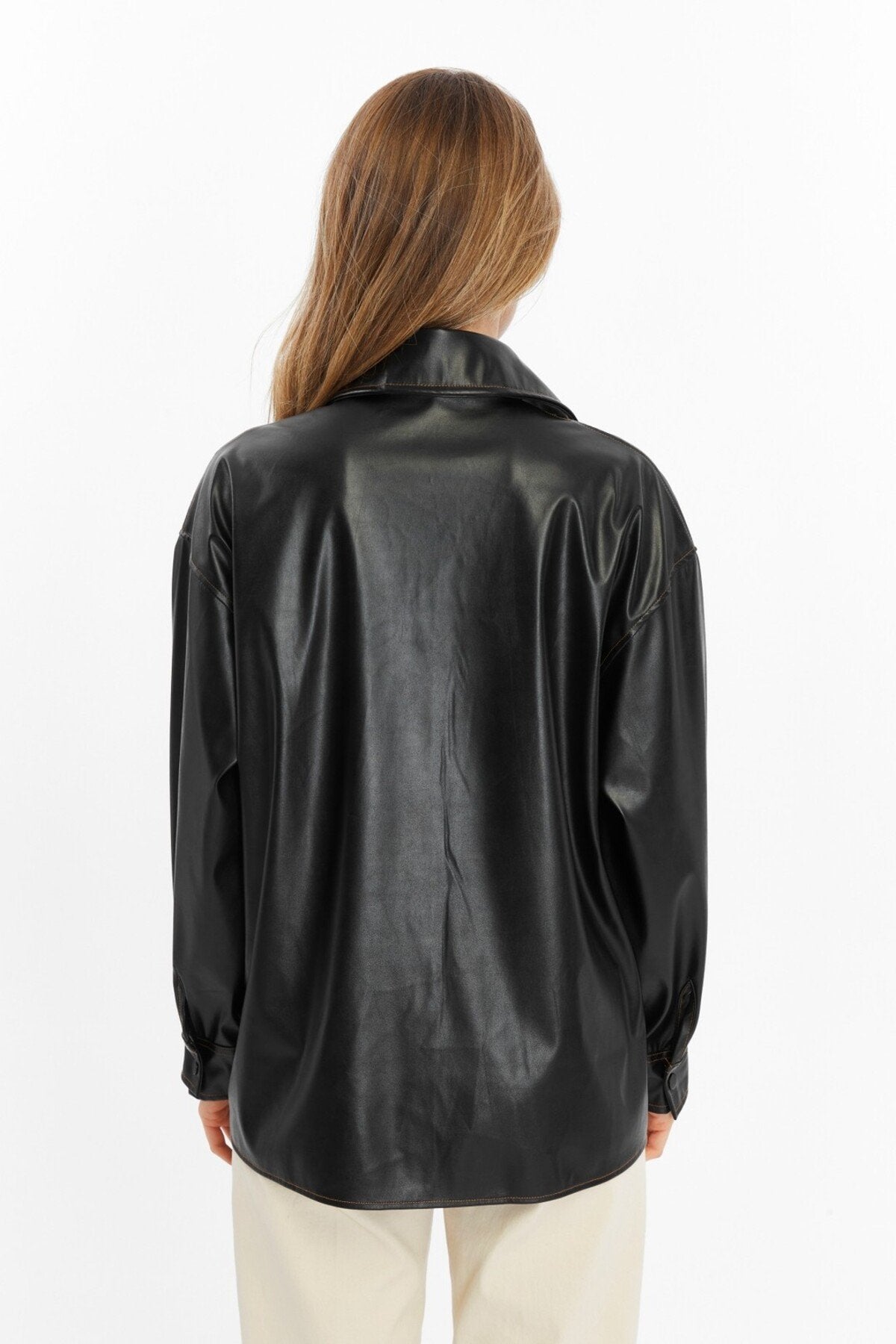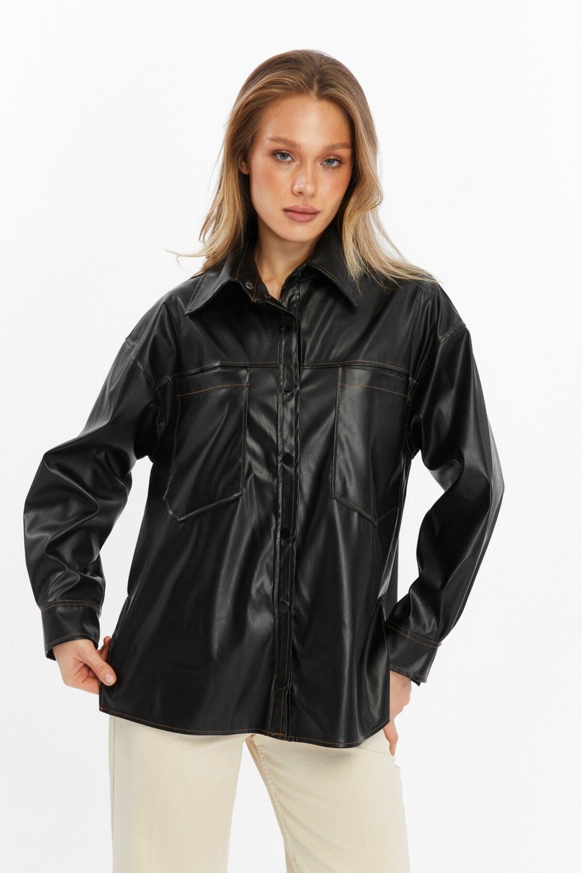 Siyah Kontrast Dikişli Suni Deri Gömlek