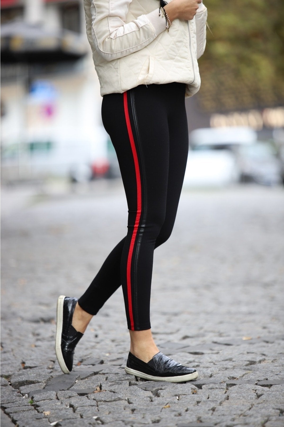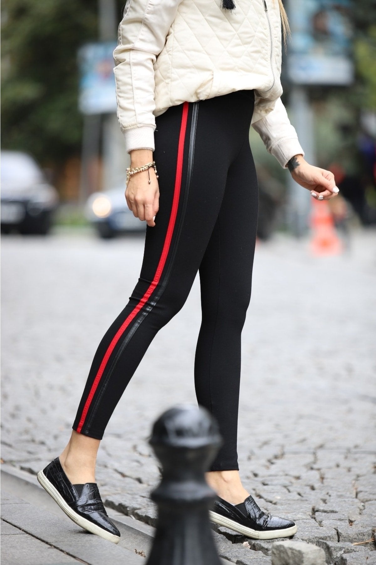 Siyah Yanı Kırmızı Ve Deri Biyeli Yüksek Bel Toparlayıcı Tayt