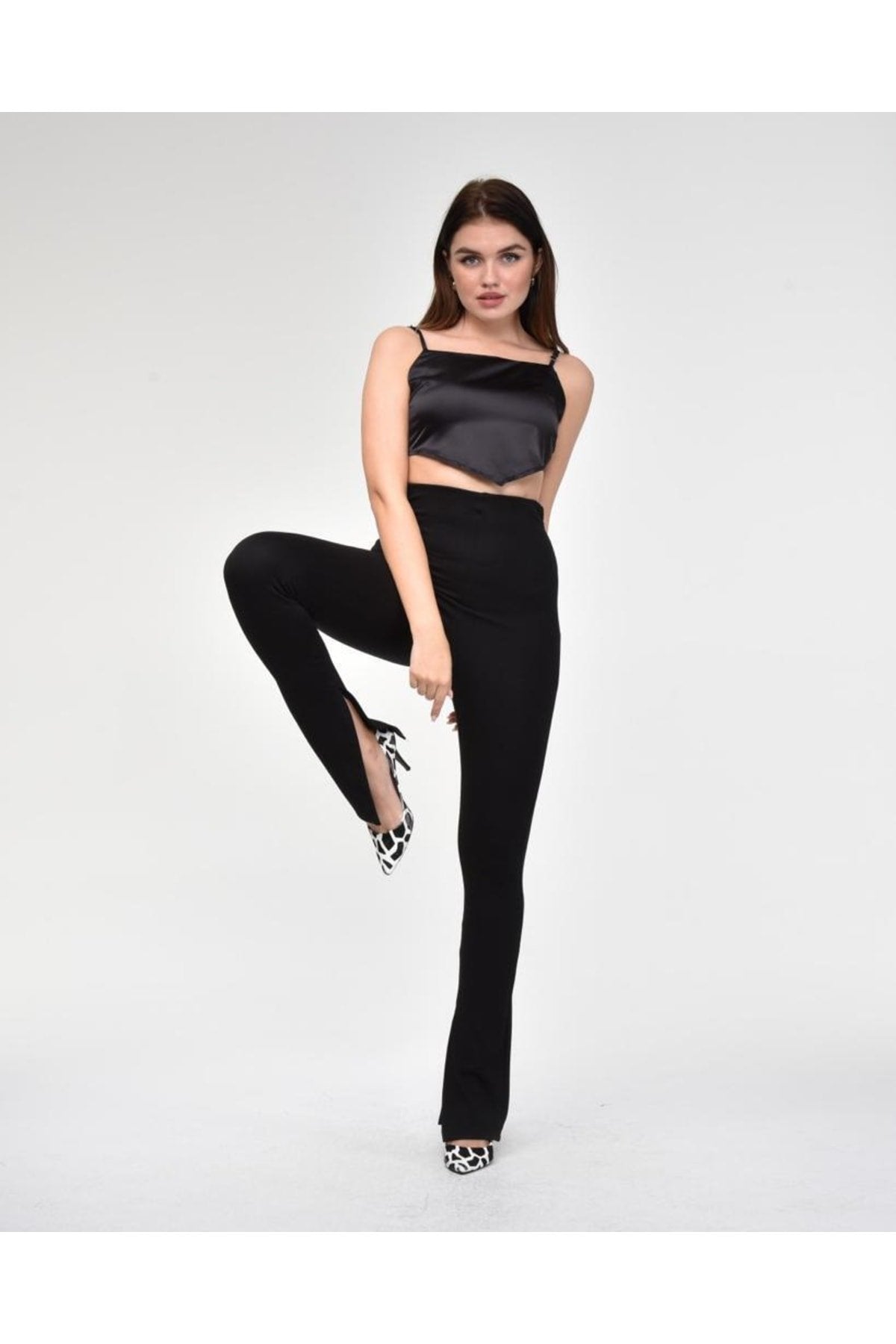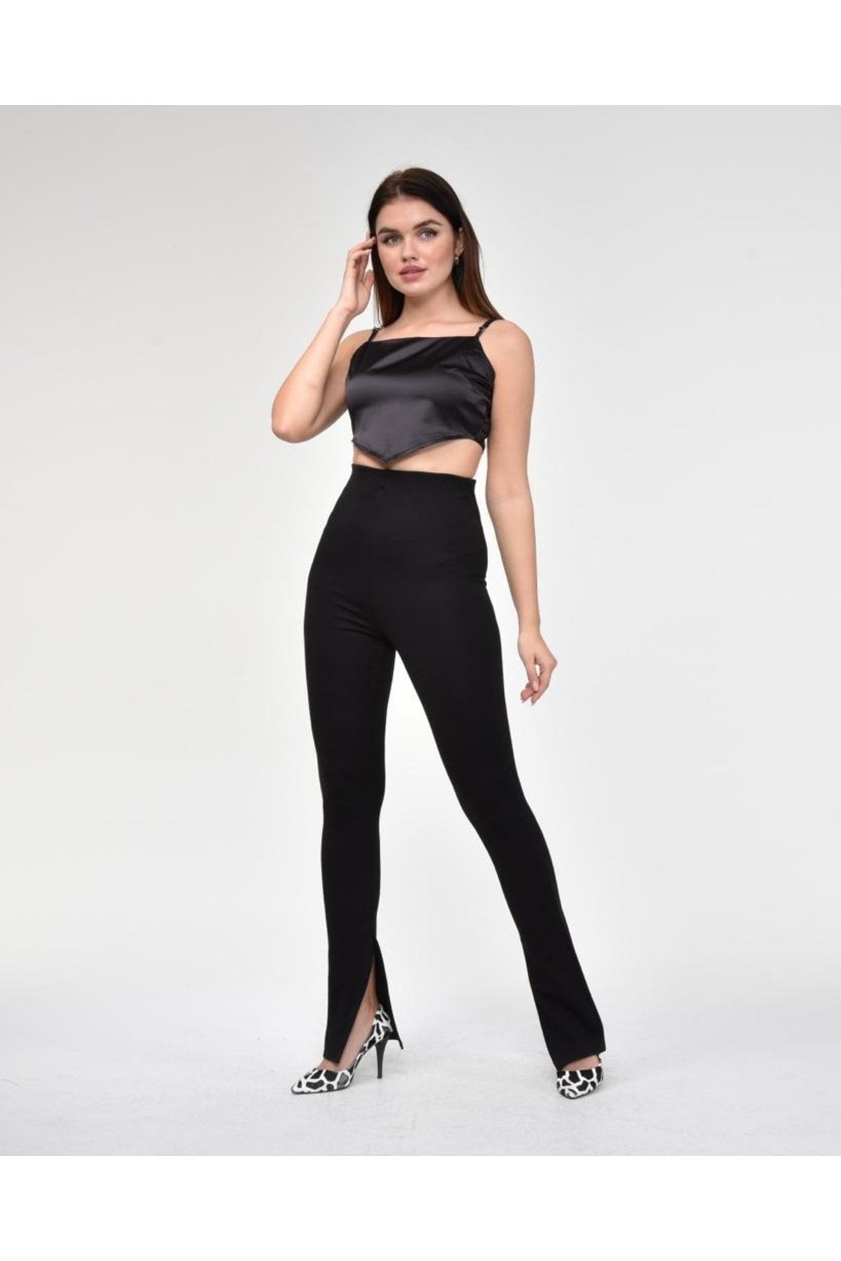 Siyah Yüksek Bel Iç Paça Yırtmaçlı Bol Paça Toparlayıcı Tayt